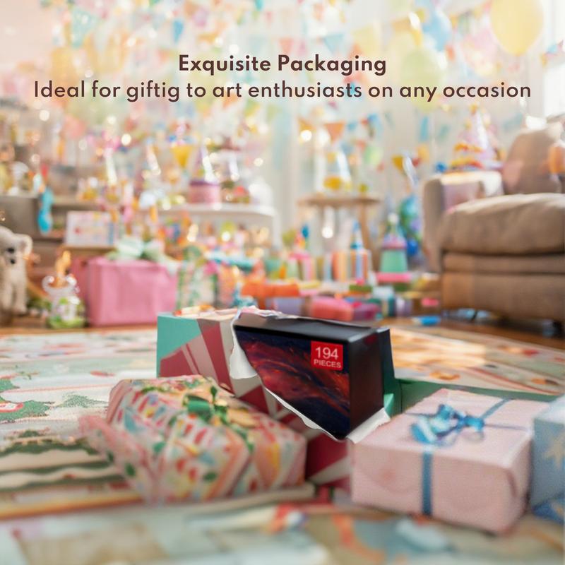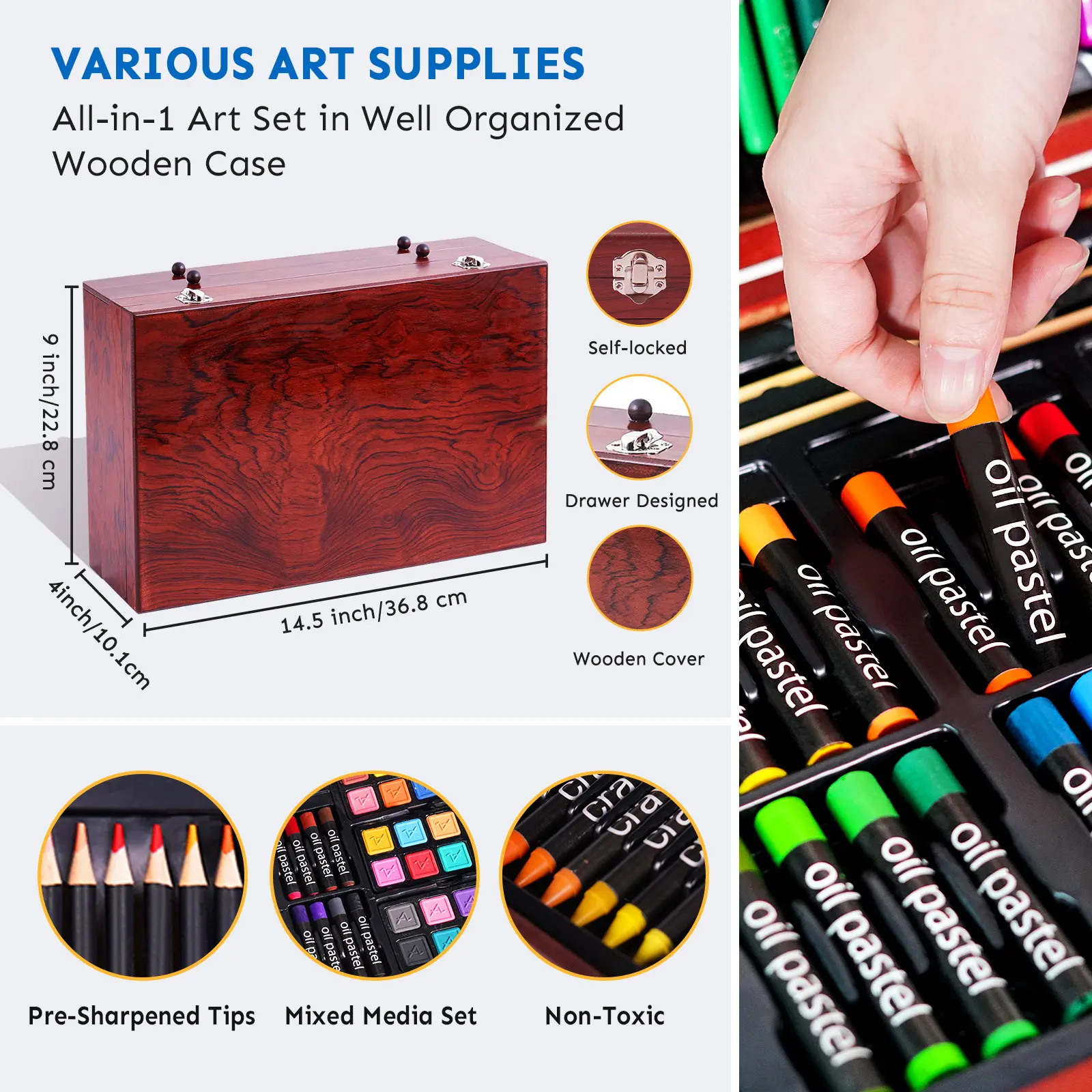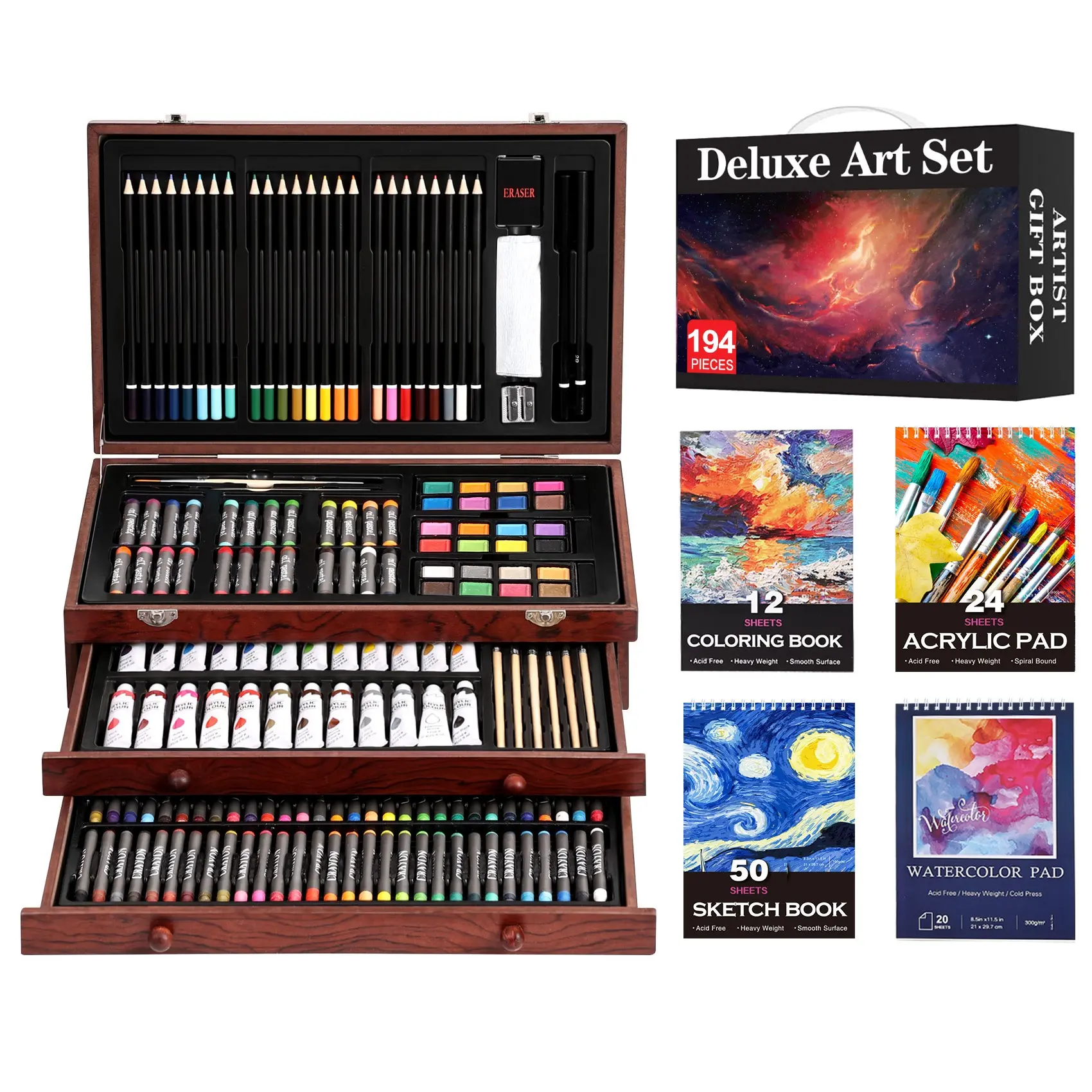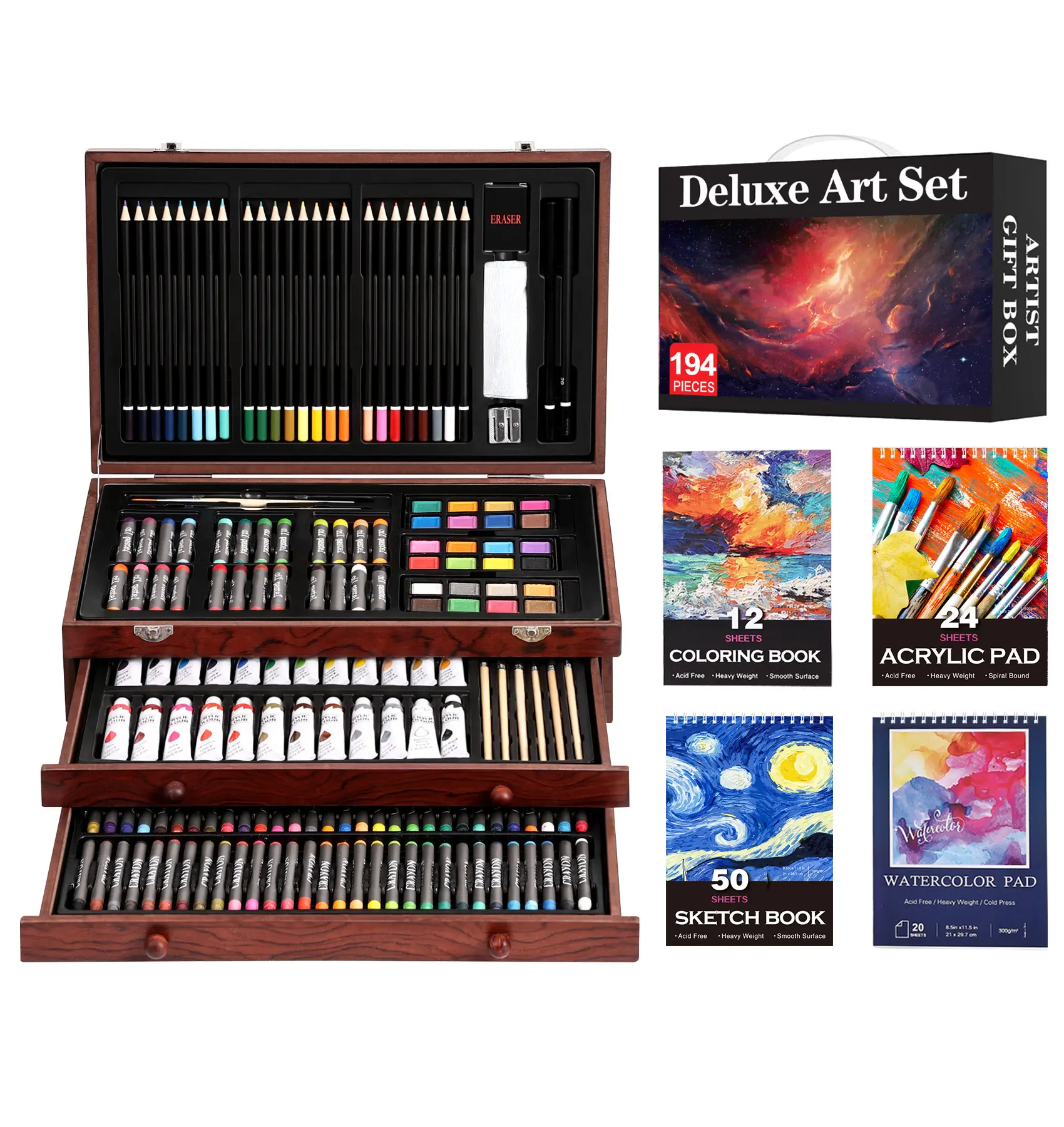 Explore a variety of A4 drawing pads and 3 A4 canvas boards to unleash your imagination. This complete package with everything you need — just open and start creating! The wooden case art kit neatly organizes all your painting essentials for easy access.