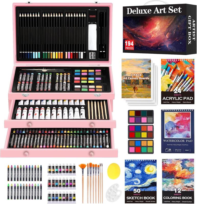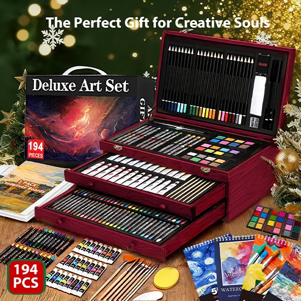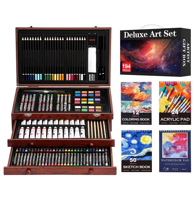 Start your art journey with this complete beginner-friendly deluxe art kit. It includes 60 crayons, 24 colored pencils, 24 oil pastels, 24 watercolor cakes, 24 acrylic paints, 11 sandpapers, 8 brushes, 3*8-well palettes, 3*A4 canvases, 1 color wheel, 1 sponge, 1 color palette, 1 HB pencil, 1*2B pencil, 1 eraser, 50-sheet sketchbook, 24-sheet acrylic pad, 20-sheet watercolor pad, 12-sheet coloring book, 1 sharpener, 1 wooden case, and 1 present box.