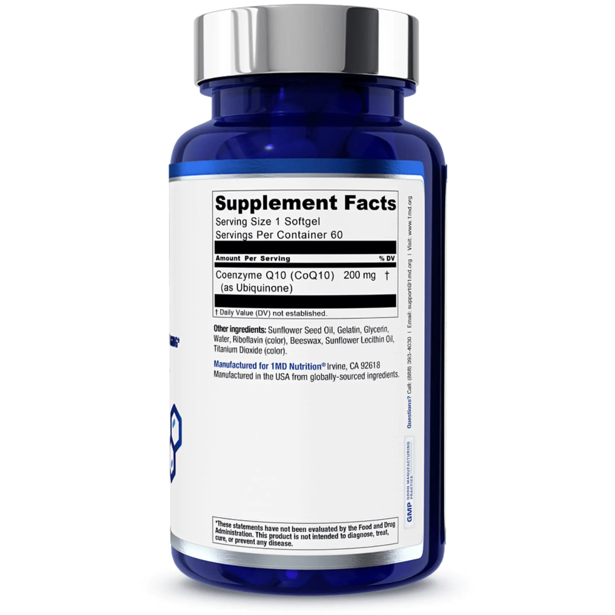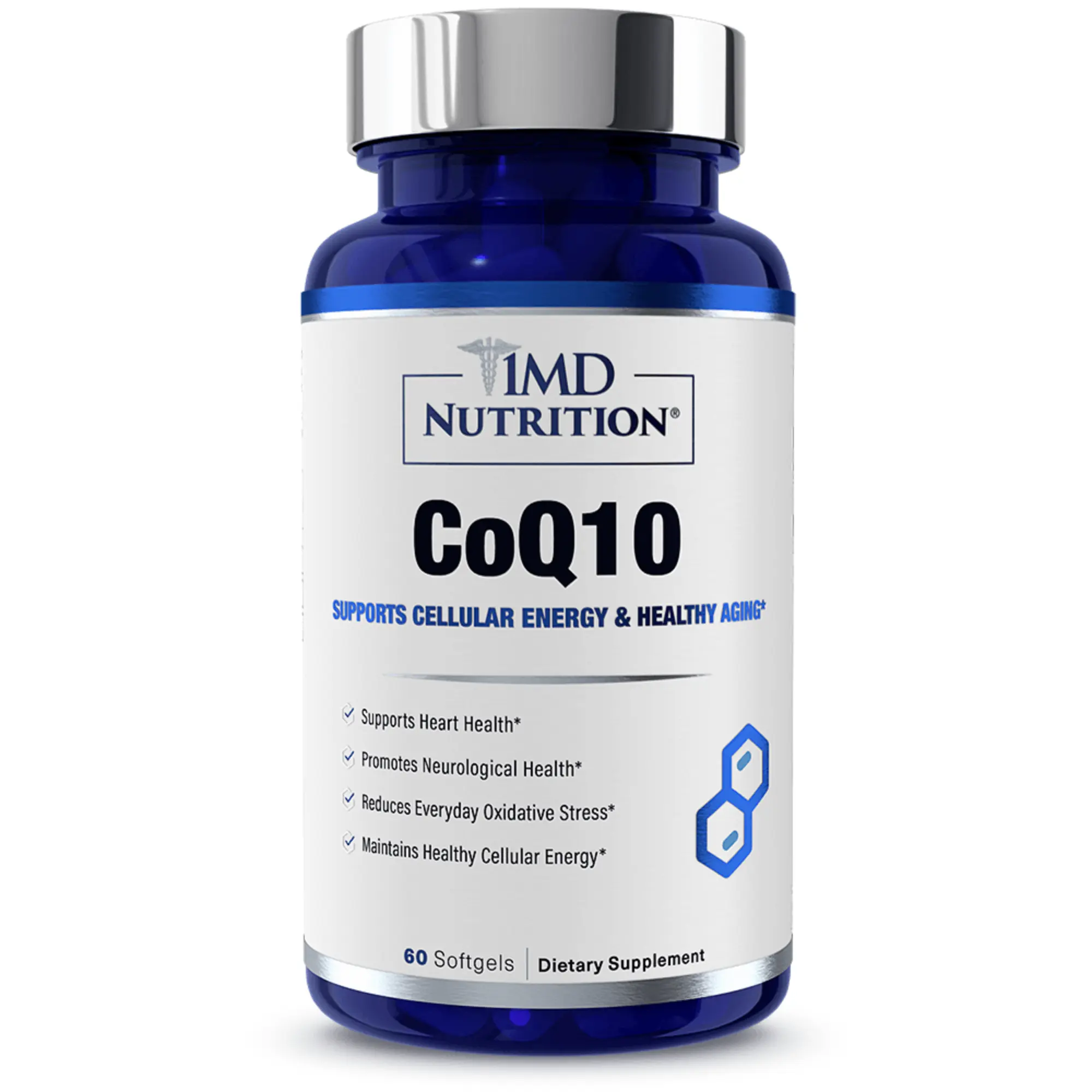 1MD Nutrition’s CoQ10 is formulated to promote healthy aging processes and provide support for cellular energy. Although CoQ10 is naturally present in the body, it decreases in aging. As a dietary supplement, 1MD Nutrition’s CoQ10 supports the body by promoting energy production, antioxidant activity, blood flow, and skin health.