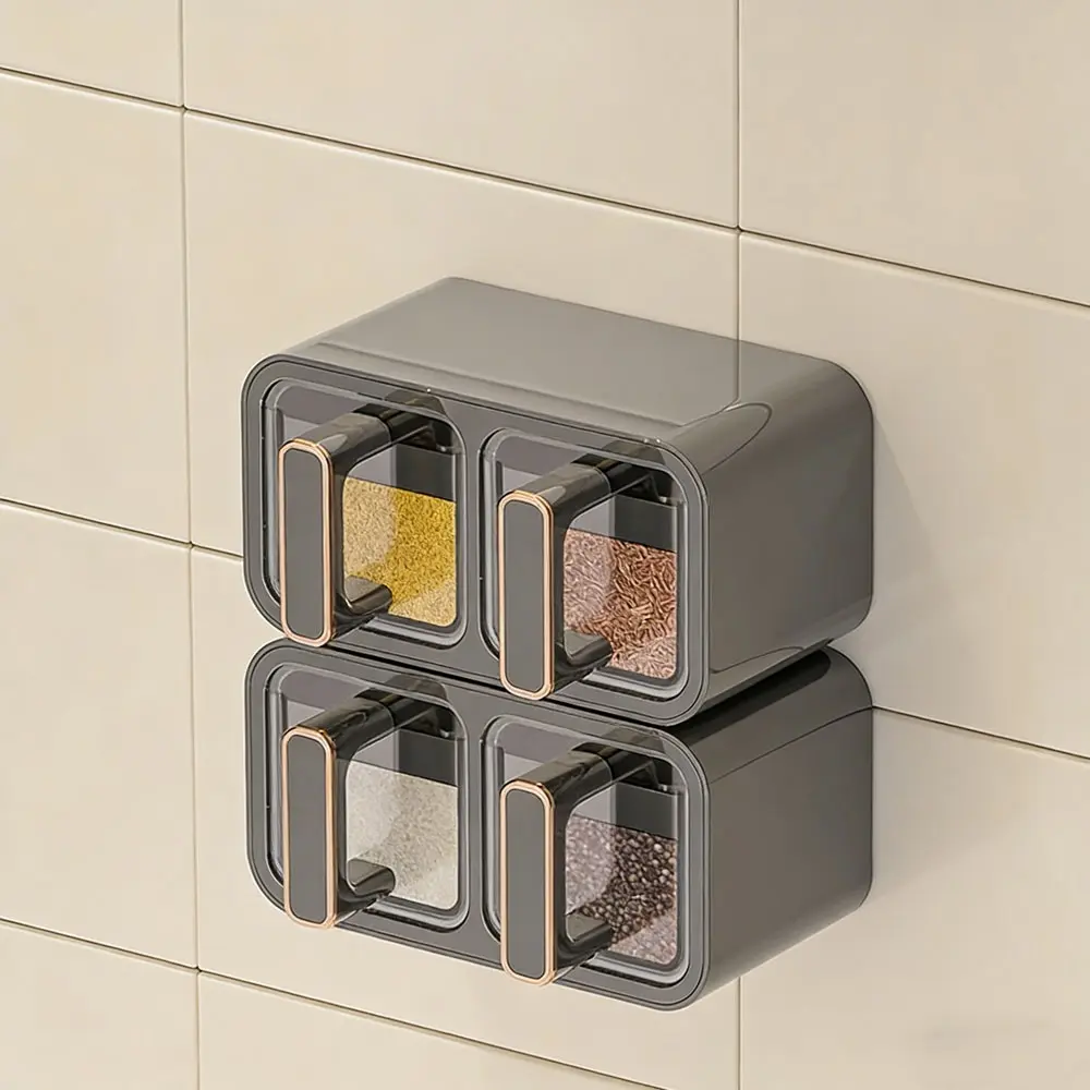 1pc Kitchen Spice Box with Spoon, Adjustable Storage Container, Wall-Mounted Sealed Seasoning Set, Multi-Functional Organizer