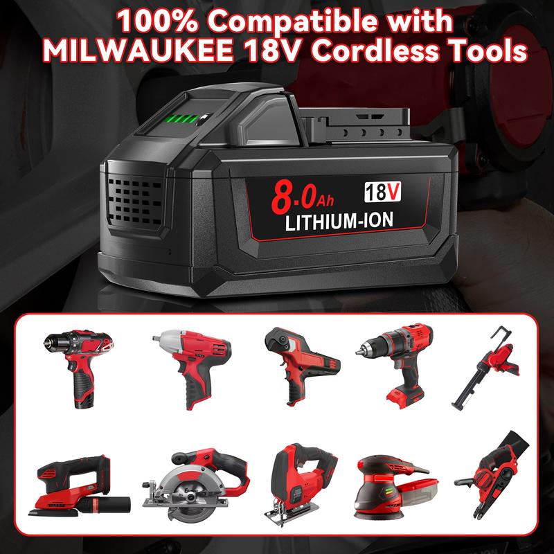 【High Output】Higher Capacity: 8000mAh/8.0Ah, powerful lithium battery cells, Voltage: 18V for milwaukee m18 battery Lithium Ion Battery. The battery for milwaukee 8.0 provides more running time for your tools