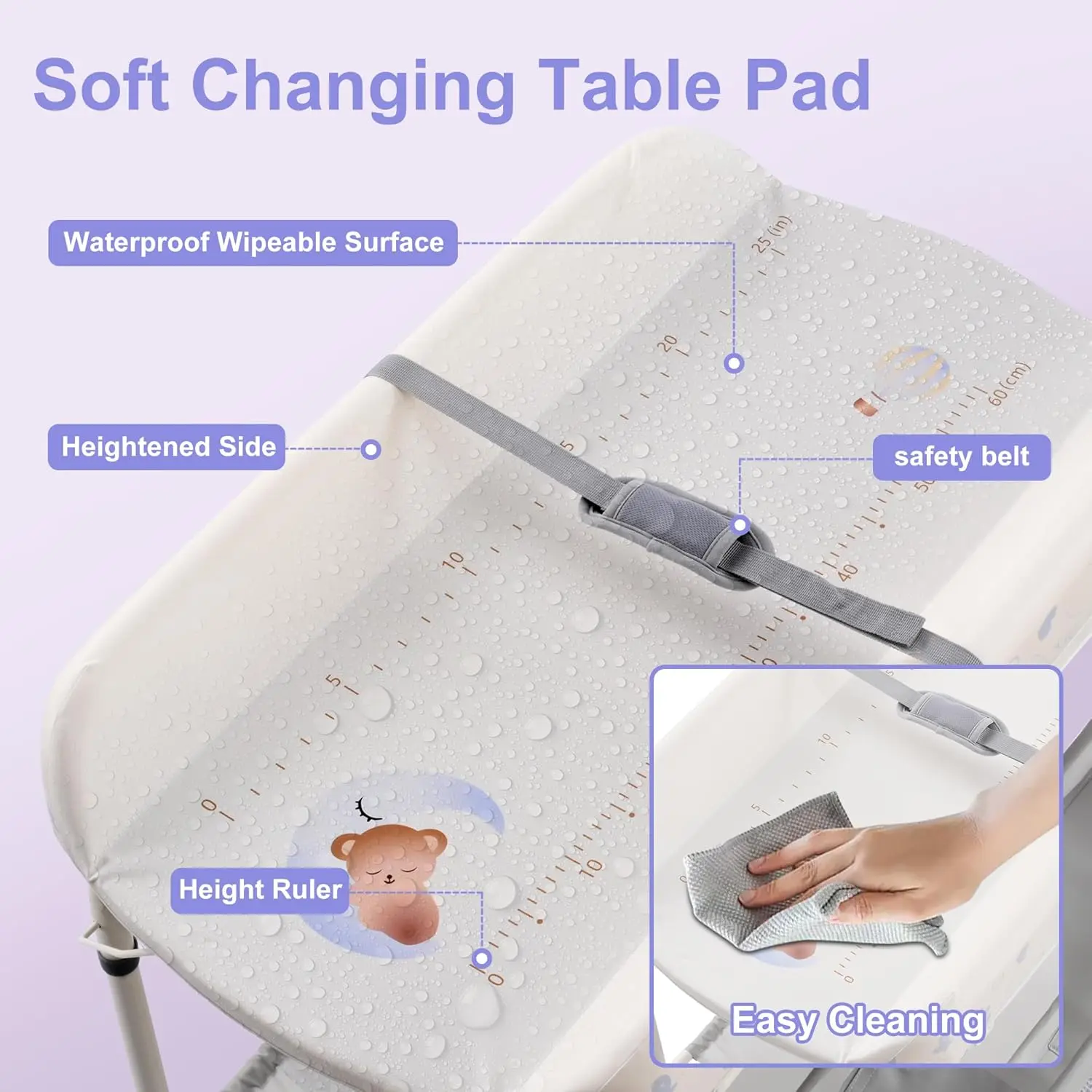 Not thin, this baby changing station comes with a super soft pad that is waterproof and wipeable.