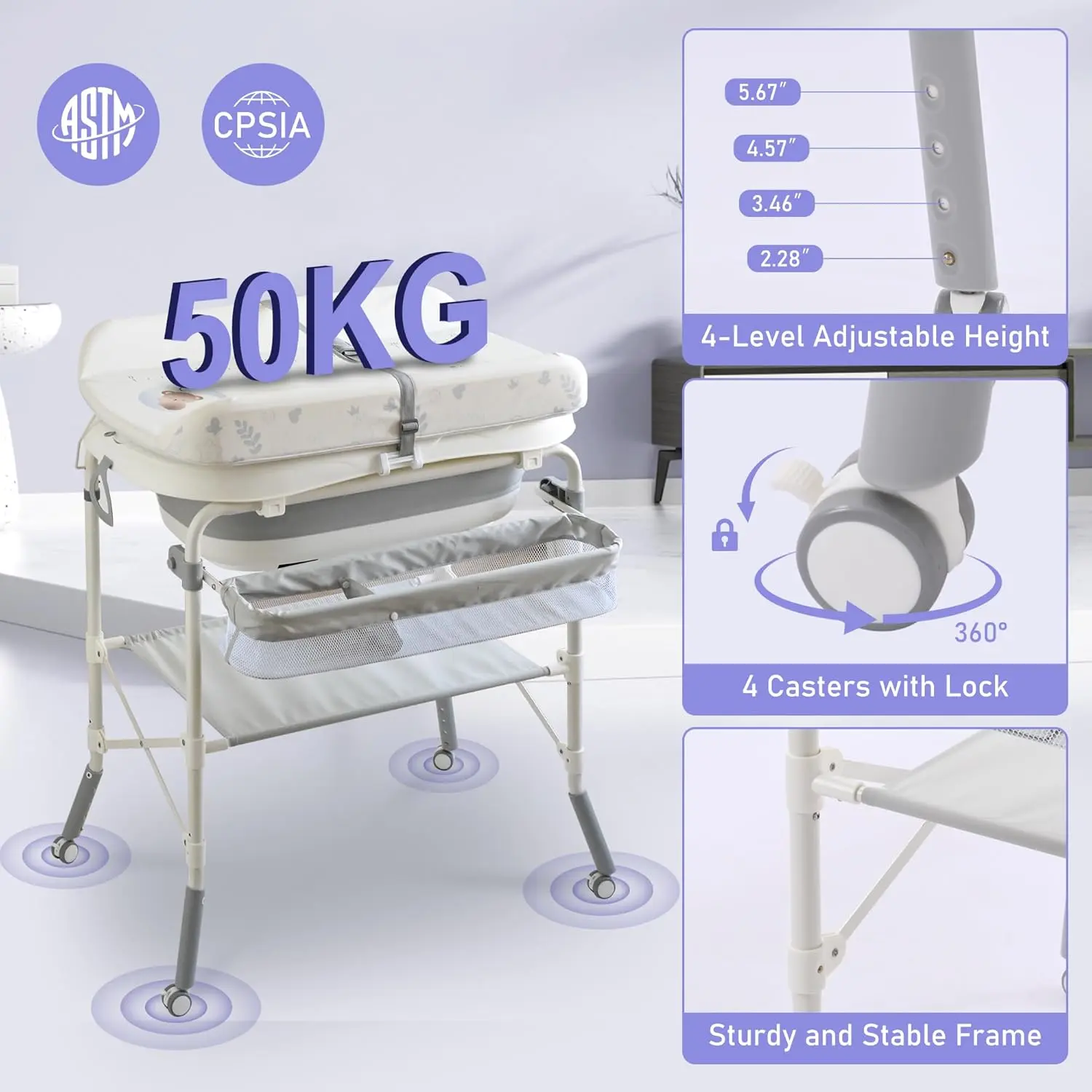 The portable changing table comes with 4 360° lockable gimbals that you can lock during diaper changes so it won't move