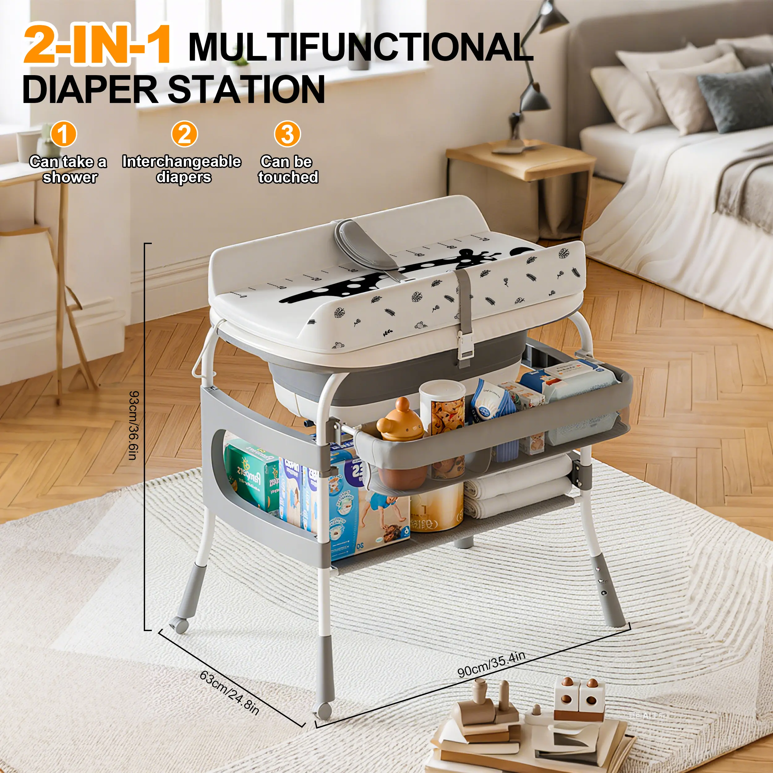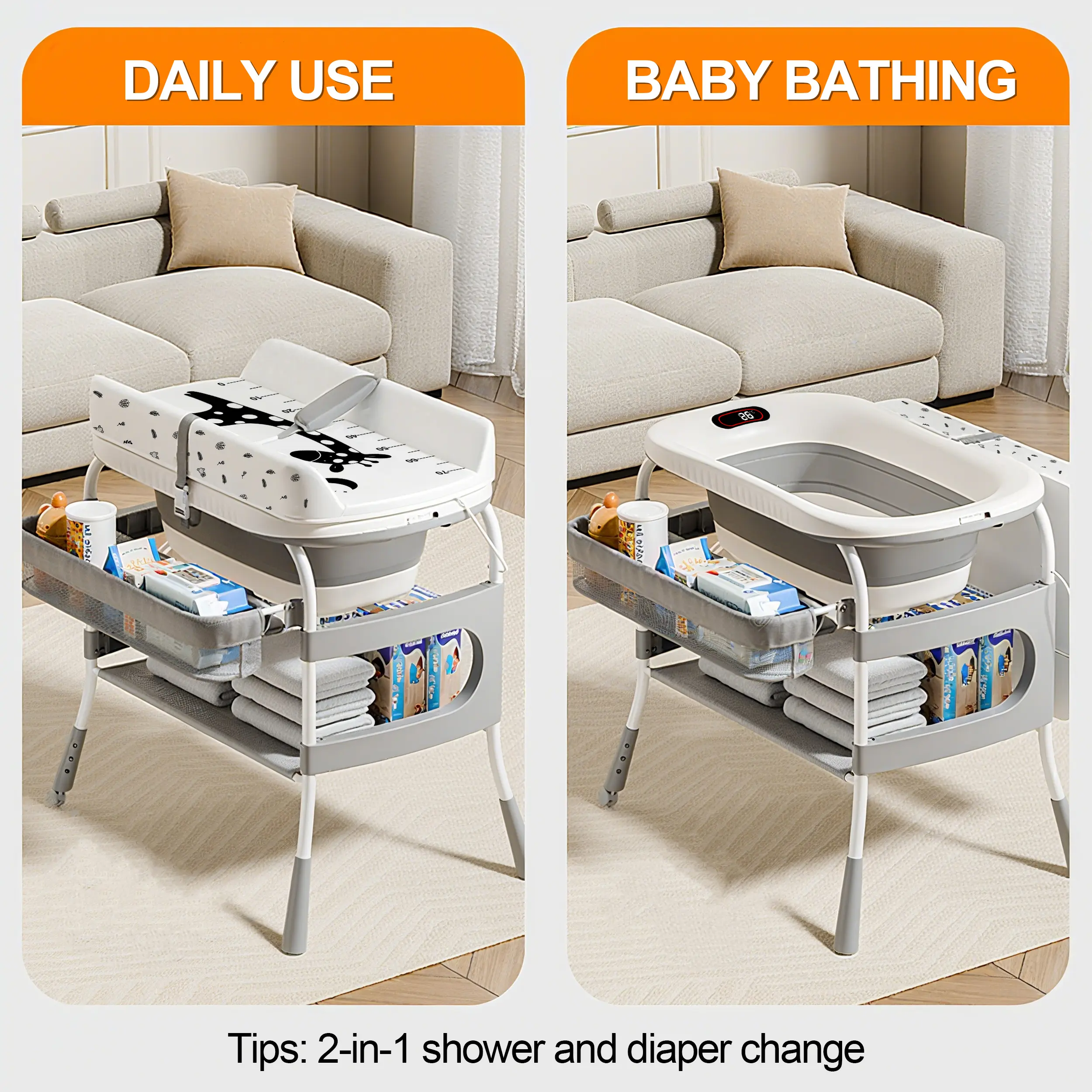 ·Dual storage: Side basket for diapers/wipes + bottom shelf for bath essentials