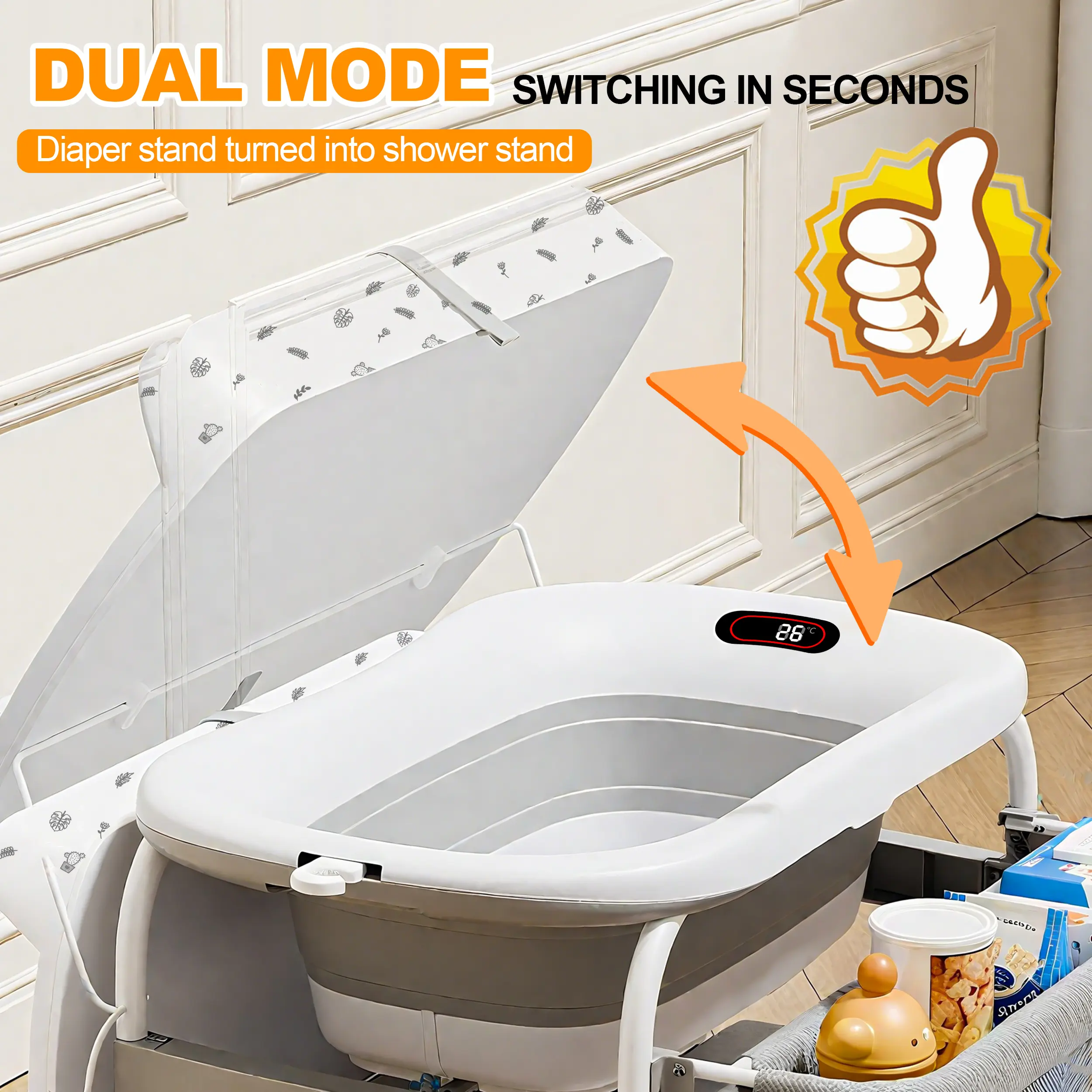 ·Diaper Changing Mode: Stand-up height: No more back pain from bending over Double safety: Side guardrails + safety belt to secure wiggly babies Built-in height scale: Track your baby’s growth anytime Soft waterproof sponge pad: Wipes clean in seconds