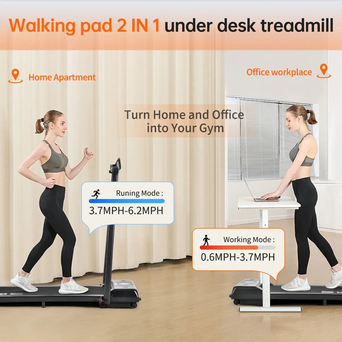 The 2-in-1 walking mat treadmill is designed for users up to 300 lbs, ensuring outstanding durability and stability. It comes with a remote control for effortless pace adjustments and features wheels for easy mobility. Its folding design and quiet operation make it perfect for both home and office environments.