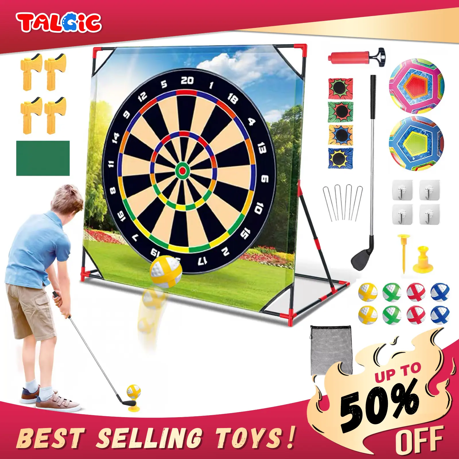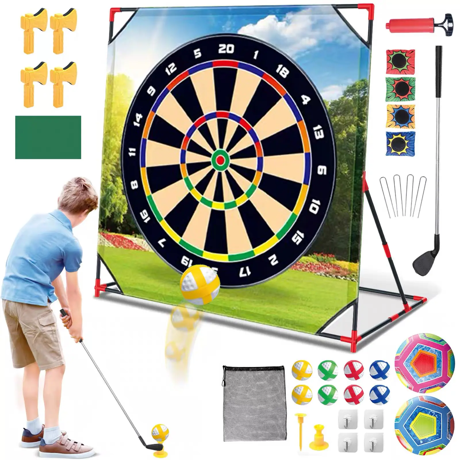 This versatile game set is ideal for kids and adults. It features a golf dartboard and clubs, making it a fun indoor/outdoor activity. The set includes balls and accessories, enhancing the gaming experience. Enjoy the challenge of hitting targets with precision and style.