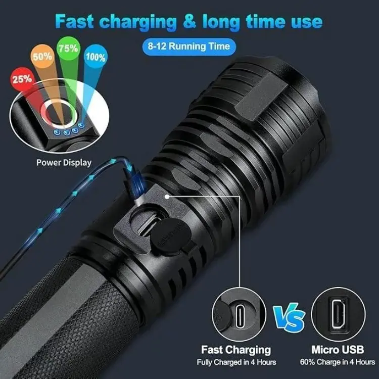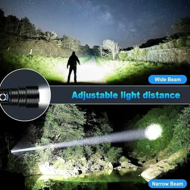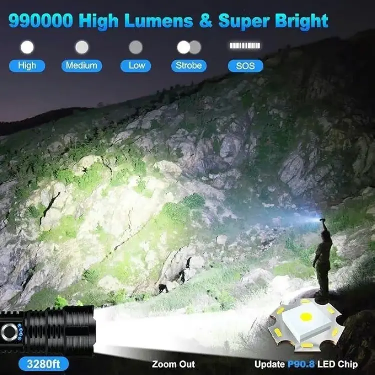 ✨ High lumens flashlights feature a super bright LED chip, producing up to 3000 lumens. It illuminates objects up to 3,280 feet away and lights a 120-square-meter room. Perfect for home, emergencies, camping, and hiking.