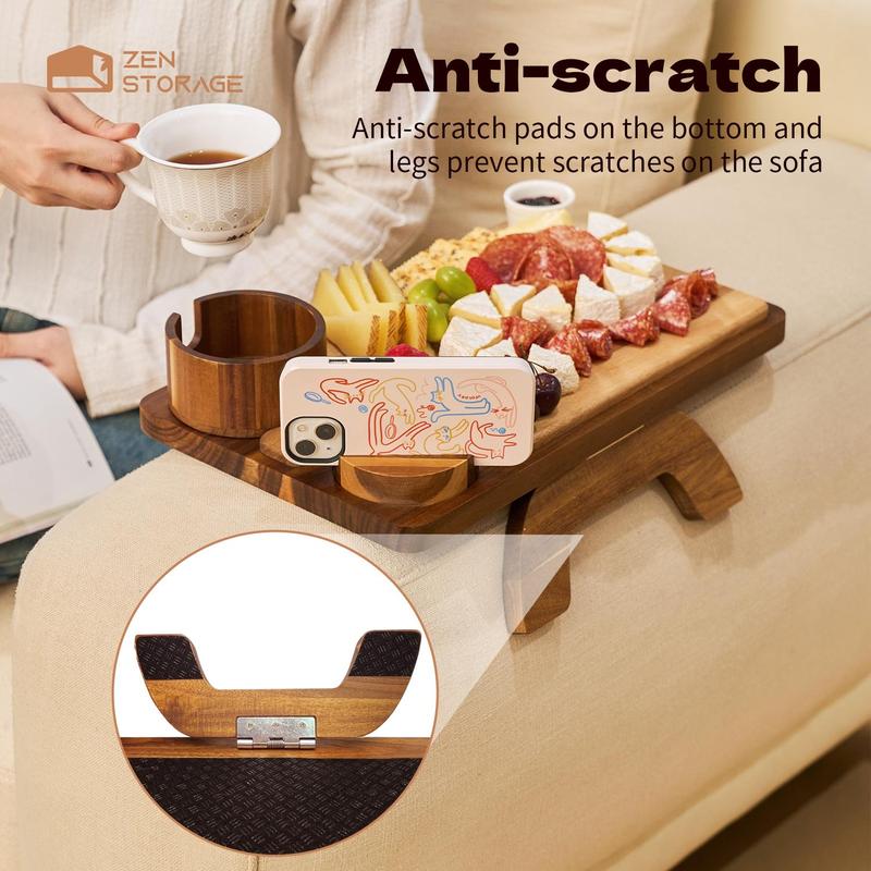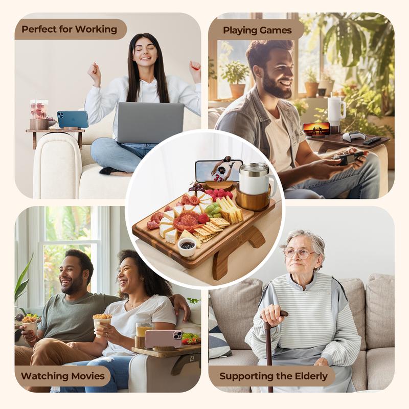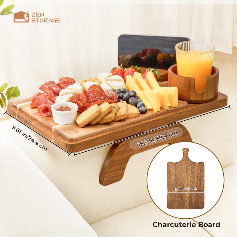 [Multifunctional] - The 4-in-1 couch arm table includes a 360° rotatable phone holder, cup holder, and detachable charcuterie board. The phone holder adjusts to any angle, and the cup holder fits mugs or glasses. The charcuterie board is ideal for bread, cheese, and cooked food, and can be used on the table or separately. Food can be placed directly on the board.