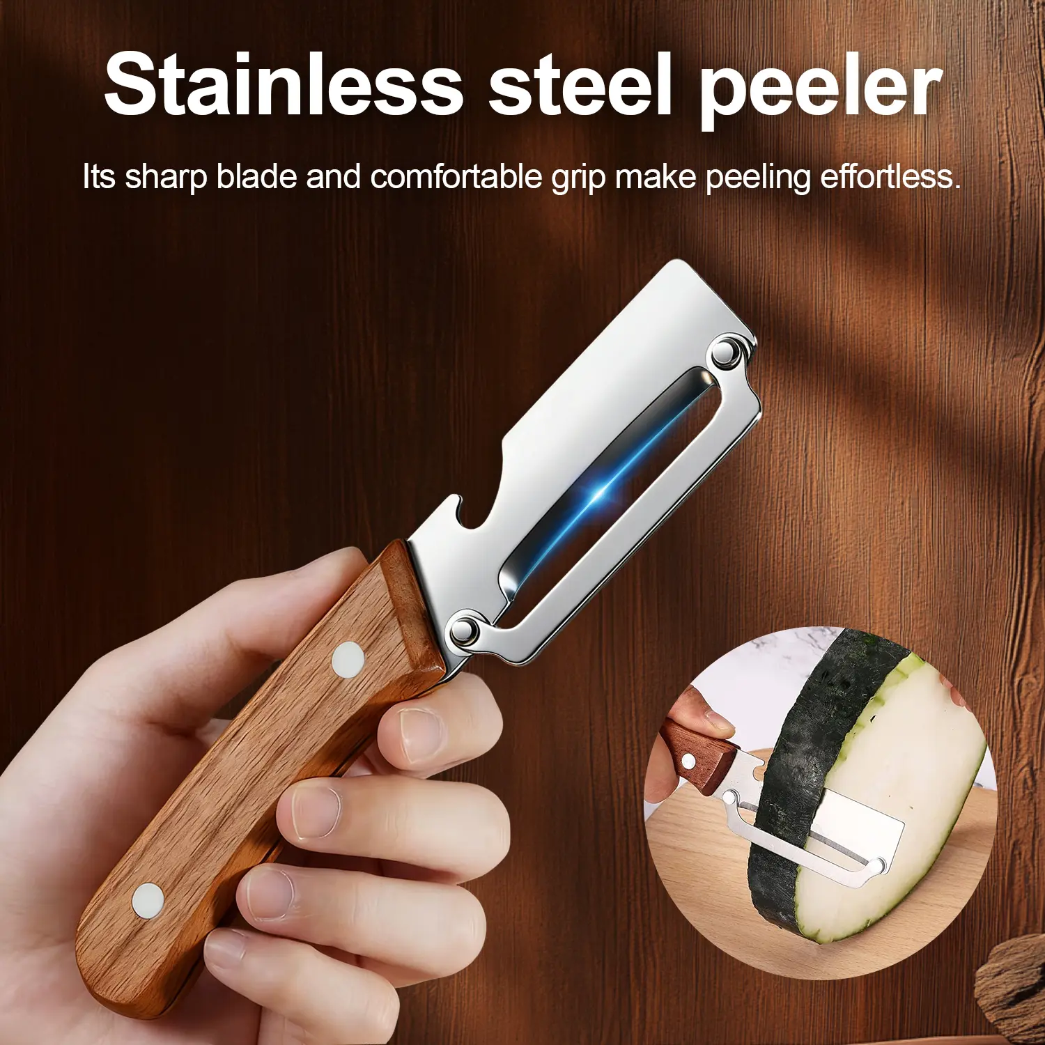 It has a wide range of uses. This vegetable peeler can not only easily handle the peeling of potatoes, carrots, cucumbers, eggplants, tomatoes, apples, pears and other fruits and vegetables, but is also equipped with a bottle opener function, which brings endless convenience to your daily life.
