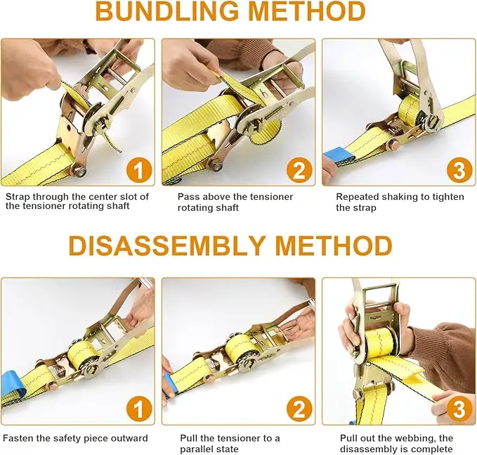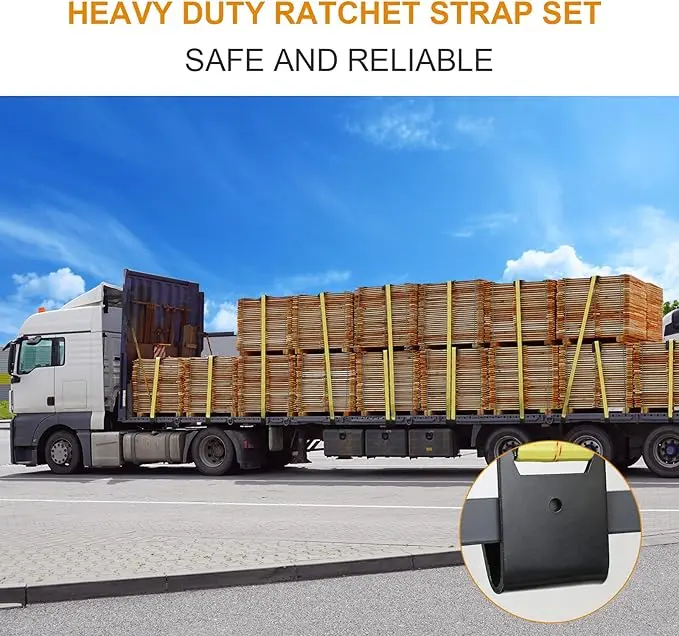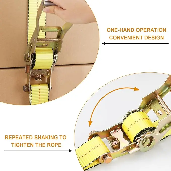 Equipped with an easy-release mechanism, these ratchet tie-down straps are versatile tools suitable for cargo transportation bundling, kayak transportation, fixed large shelves, Flatbed trailer moving, fixed cargo pallets and box moving, etc.