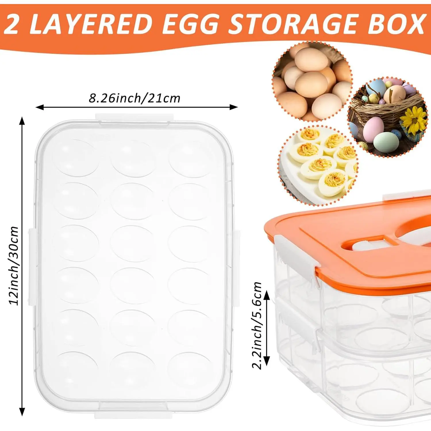 Double-layer large capacity: This 2-layer egg tray carrier can hold 18 eggs per layer, with a total capacity of 36 eggs. It measures 12x8.7x4.5 inch, saving space in your refrigerator. The separable design of the upper and lower layers allows for flexible use, meeting the needs of daily family use or gatherings, and preventing eggs from piling up and becoming