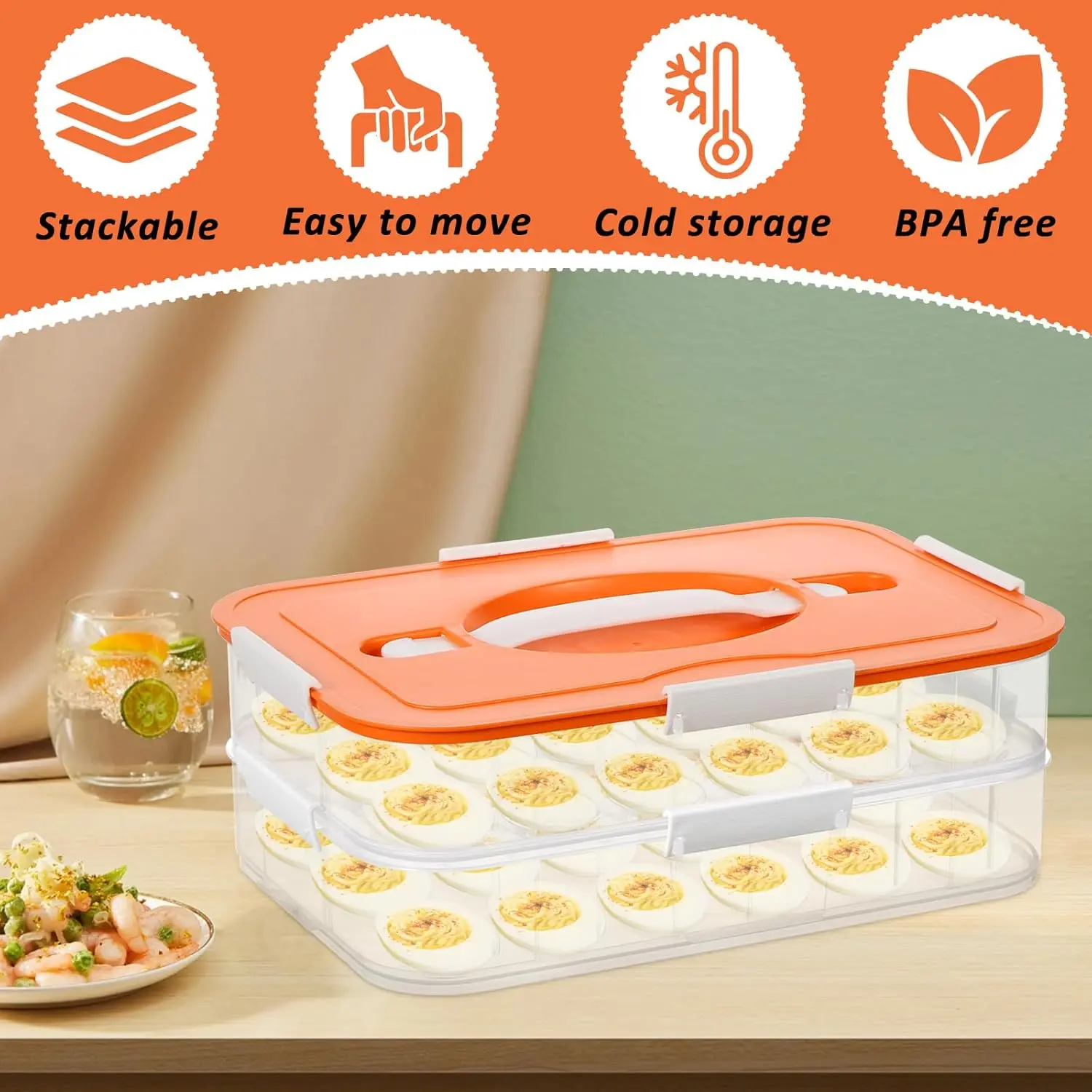 Transparent visibility: The transparent of the deviled egg platter allows you to see the contents at a glance, eliminating the need to repeatedly open the lid. The lid is sealed to dust and extend the shelf life of the eggs, while also preventing odors from the refrigerator from entering, preserving the flavor of the