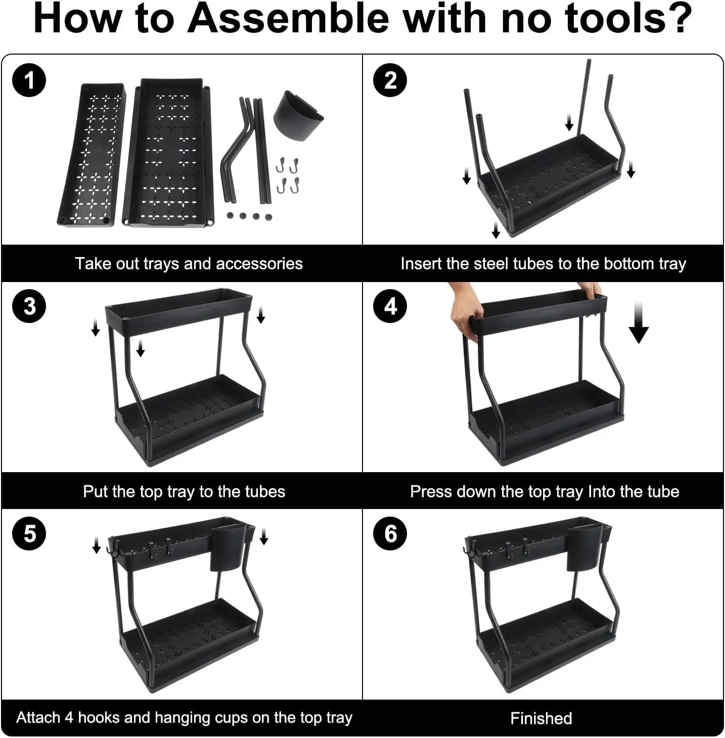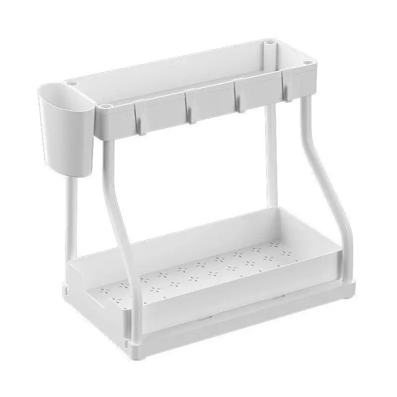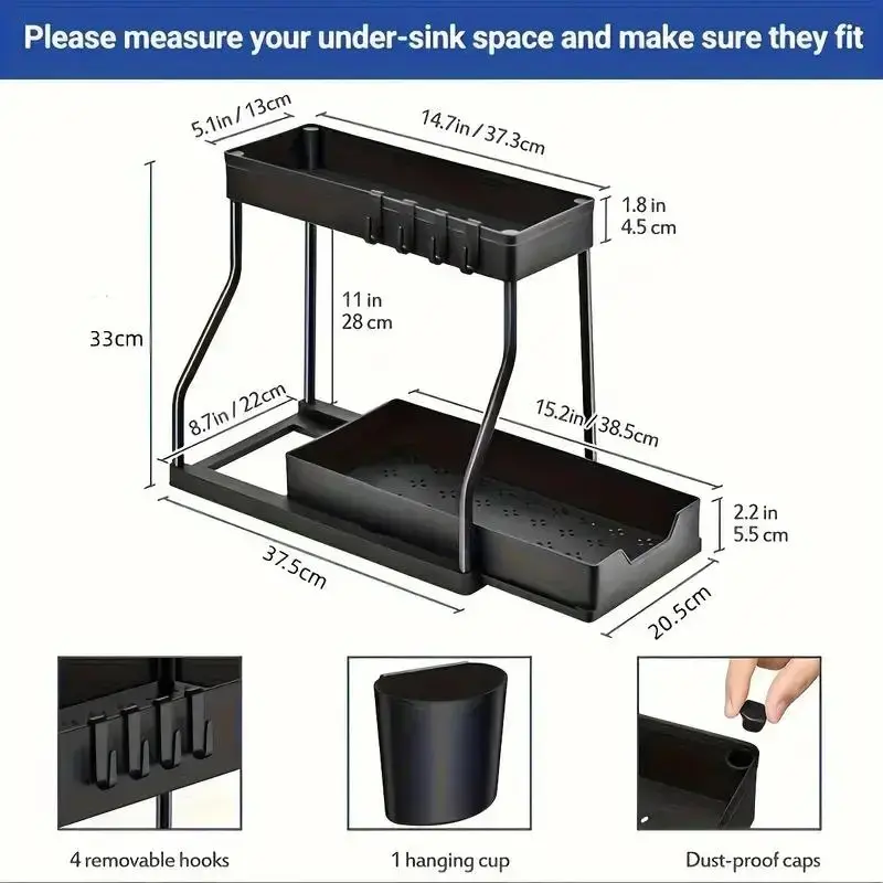 2-Layer Pull-Out Storage Rack with Adjustable Divider Drawer Organizer Large-Capacity Sliding Shelf for Kitchen & Bathroom Space-Saving Dish Rack Dual-Layer Under Sink Storage Plastic Organizer with Hook for Cabinet Storage