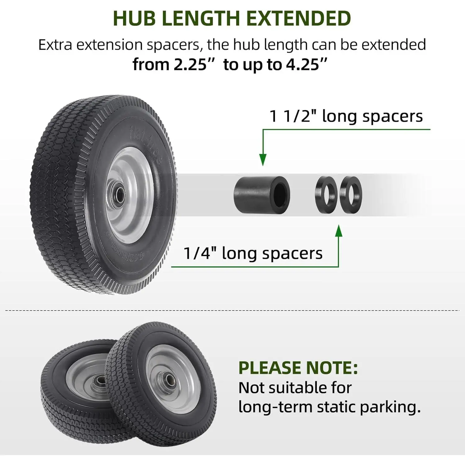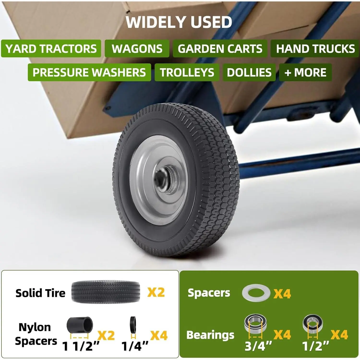 10" SOLID TIRES AND WHEELS FOR UTILITY EQUIPMENT - 10 Inch solid wheel highly compatible with yard , wagons, wheelbarrows, hand , dollies, trolleys, lawn mowers, and ! Convert now to efficient and maintenance-free tire and wheel assemblies! (Please note: Not suitable for long-term static parking.)