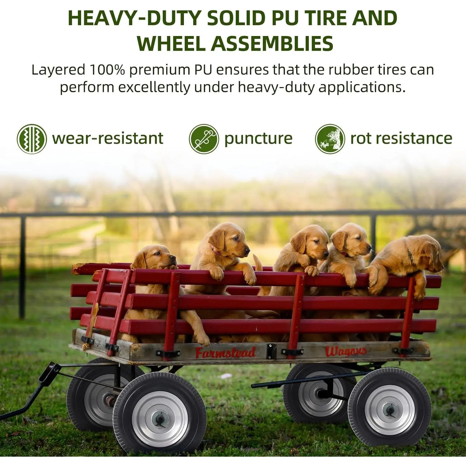 HEAVY-DUTY SOLID PU TIRE AND WHEEL ASSEMBLIES - The layered PU ensures that the rubber tires can perform excellently under heavy-duty applications. The solid and durable construction ensures that the tires are wear, puncture, , and rot-resistant. The rims are steel with solid metal hubs that resist cracks and suitable for -terrain use.