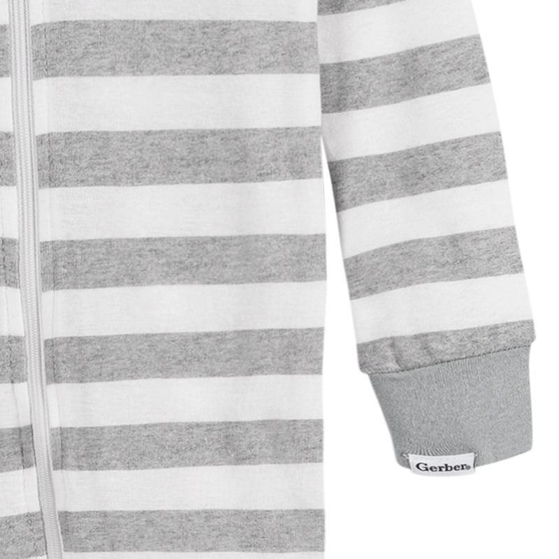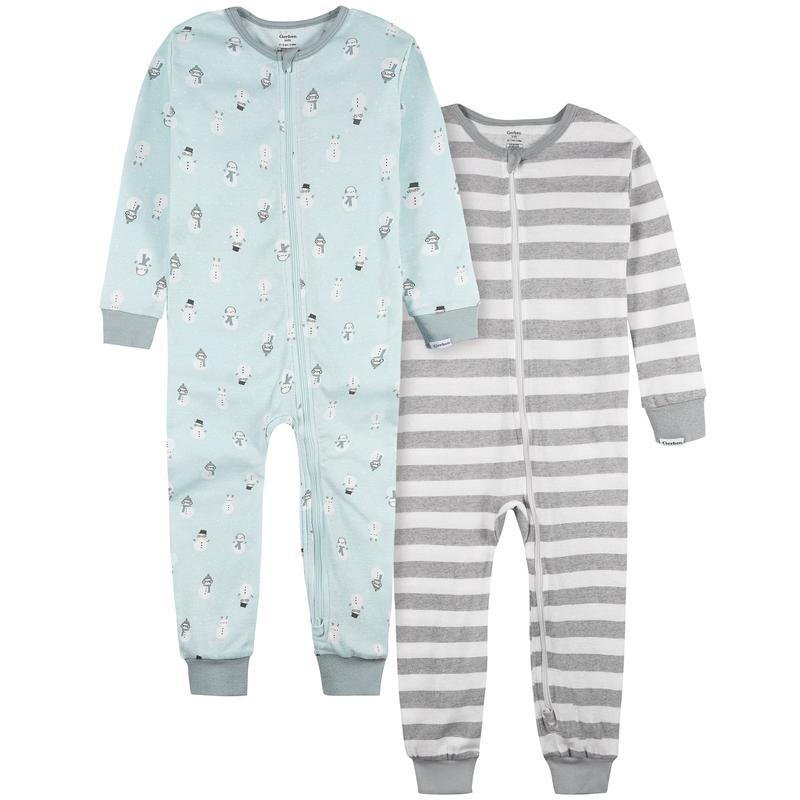 Get your little one ready for snuggly nights with this holiday-themed 2-pack of snug-fitting footless pajamas! Made primarily from soft, durable cotton, they’re gentle on sensitive skin and designed for all-night comfort. A two-way zipper makes dressing and diaper changes quick and easy, while the rounded neckline with a zipper protector keeps baby comfy. Cinched wrists and ankles ensure a snug fit, so pajamas stay in place during sleep and play. One pair features a cheerful blue design with a playful snowman print, while the other sports classic gray and white stripes with blue trim—perfect for keeping little ones warm and cozy all season long! Our essentials have been independently certified with STANDARD 100 by OEKO-TEX® so that you don’t have to worry about harmful substances in your baby’s wardrobe. Pack includes two pajamas.