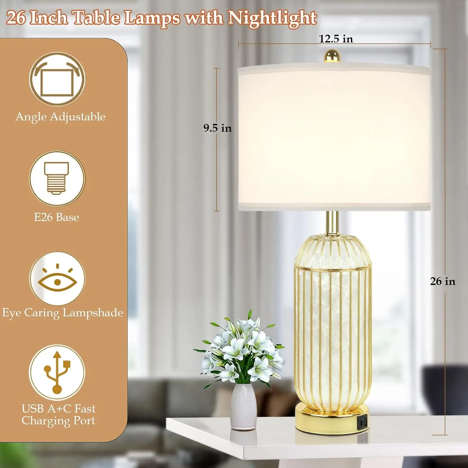 ✨ Elegant Design: The plating gold lamp base complements the silk woven lampshade, creating a classic yet modern look. The premium white silk lampshade adds a refreshing touch. This lamp fits various styles: modern, industrial, luxury, Mid-century, classic, minimalist. It features an E26 socket for versatile bulb replacements.