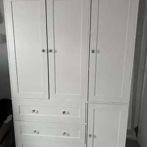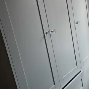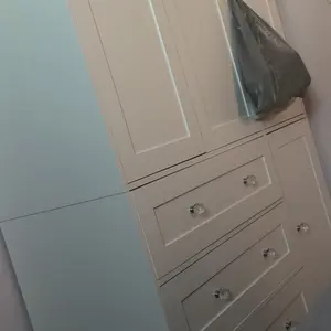 Durable particleboard, metal handles, and hidden drawer rails for smooth operation. Metal-buffered hinges ensure quiet closing.