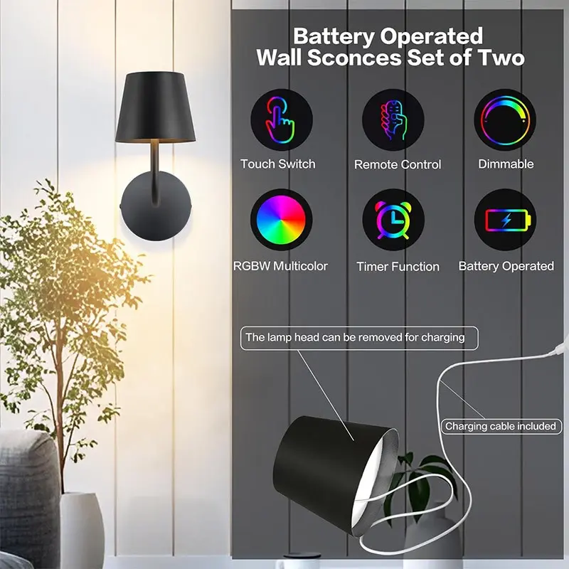 2-Pack LED Wall Lights, Remote Control, Dimmable Timer, Rechargeable Touch Control, Indoor Lighting for Bedroom Office Hallway