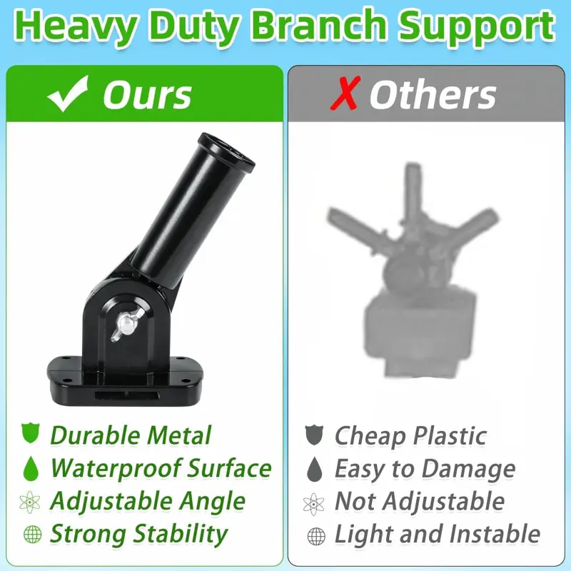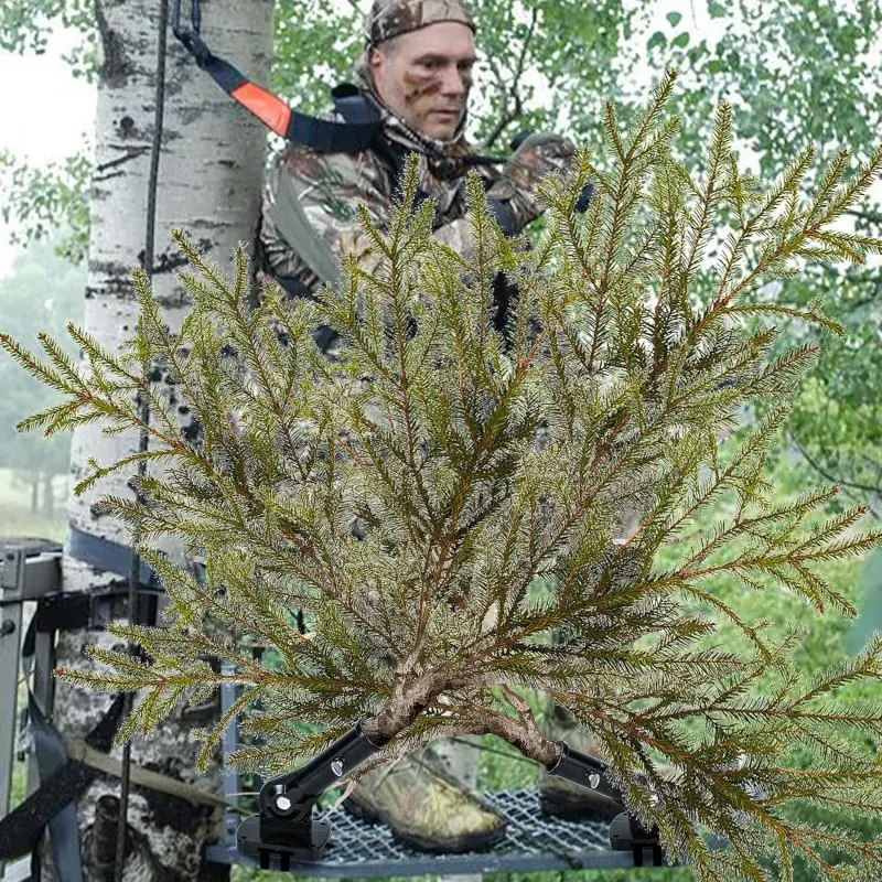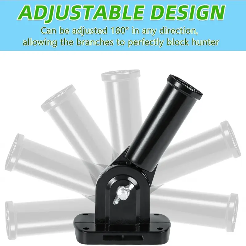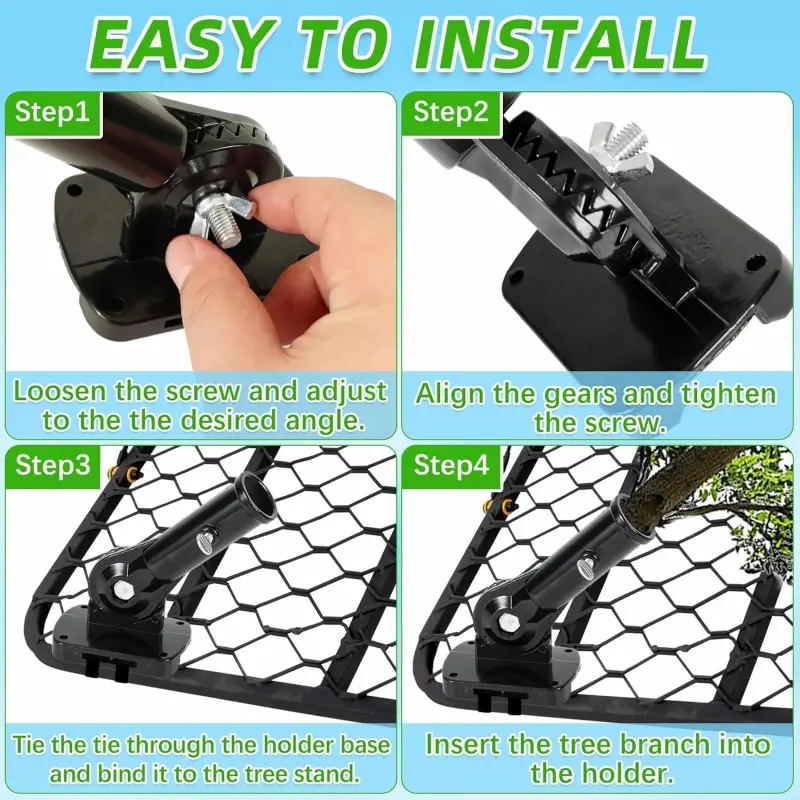 Tree Stand Accessories Kit: You can get 2 pack metal branch holders for tree stand, each equipped with 4 fixed straps.tree station accessories give you camouflage for hunting.Durable Material: This hunting blind is made of sturdy metal with a concealed black color, long-lasting and non fading, the heavy-duty structure can withstand the weight of tree branches without breaking, firmly stabilizing the branches.Free Adjustment: These adjustable hunting branch supports can be adjusted 180 degrees to the camouflage position for hunting according to your needs.Waterproof Surface: Waterproof and rustproof.The tree stand branch holder can withstand various weather conditions, supporting reliable and effective outdoor hunting even on rainy days.Easy to Install: Simply thread the straps through the base of the branch holder and fix them to the tree stand.Insert the branch and tune the angle to achieve the coverage.Easy to carry and save space.