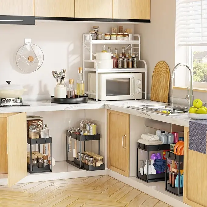 2 Pack Under Sink Organizer - This set includes two 2-tier under shelf organizers, perfect for your kitchen or bathroom. The black storage solution offers a sleek and functional way to organize your space. Ideal for maximizing storage under sinks, these organizers keep your items neatly arranged.
