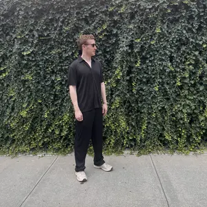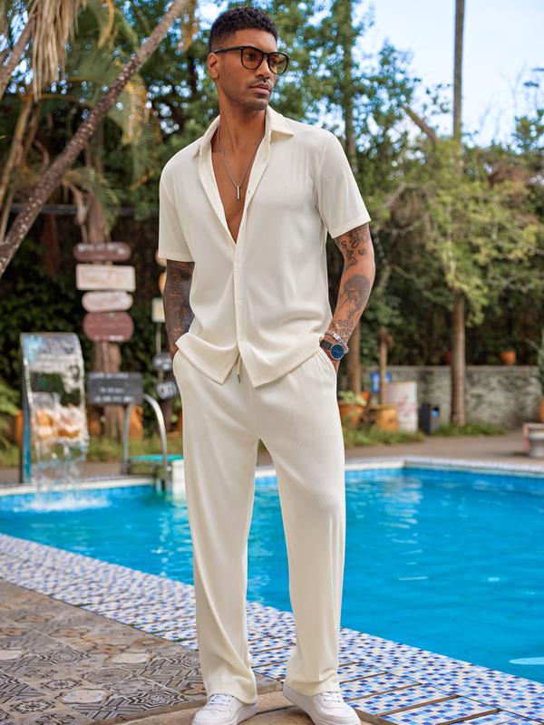 ·Classic Casual Set -- Button down shirt, short sleeve, spread collar; loose fit long pants with 2 side pockets, one back pocket, elastic waist drawstring.A simple and classic combination of a shirt and long trousers set that saves you time choosing a pairing.