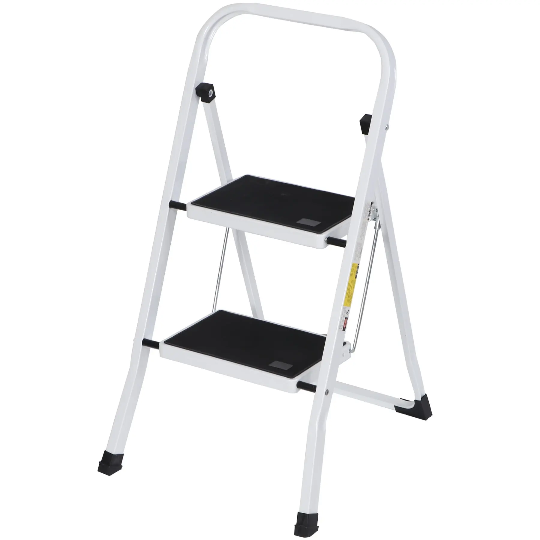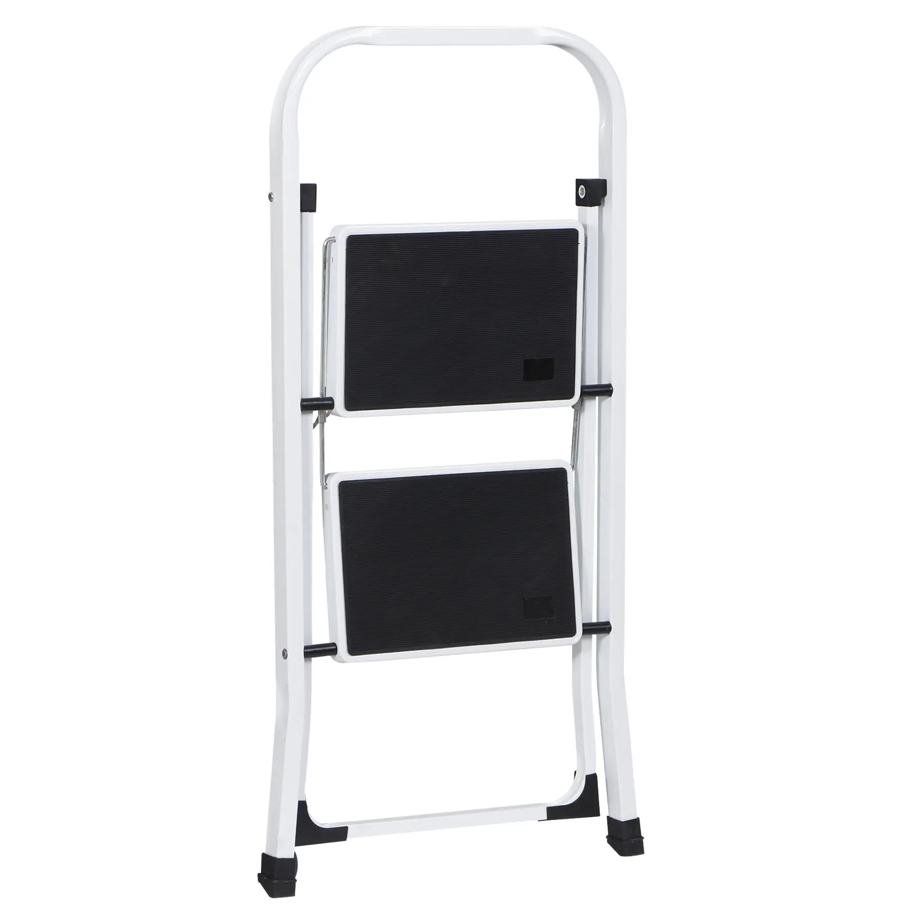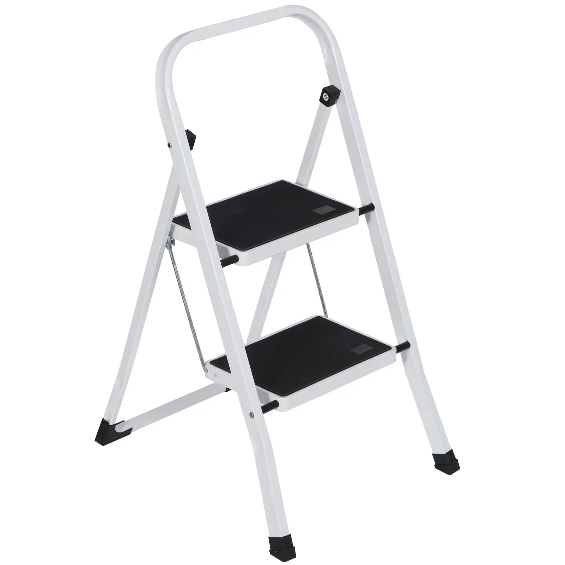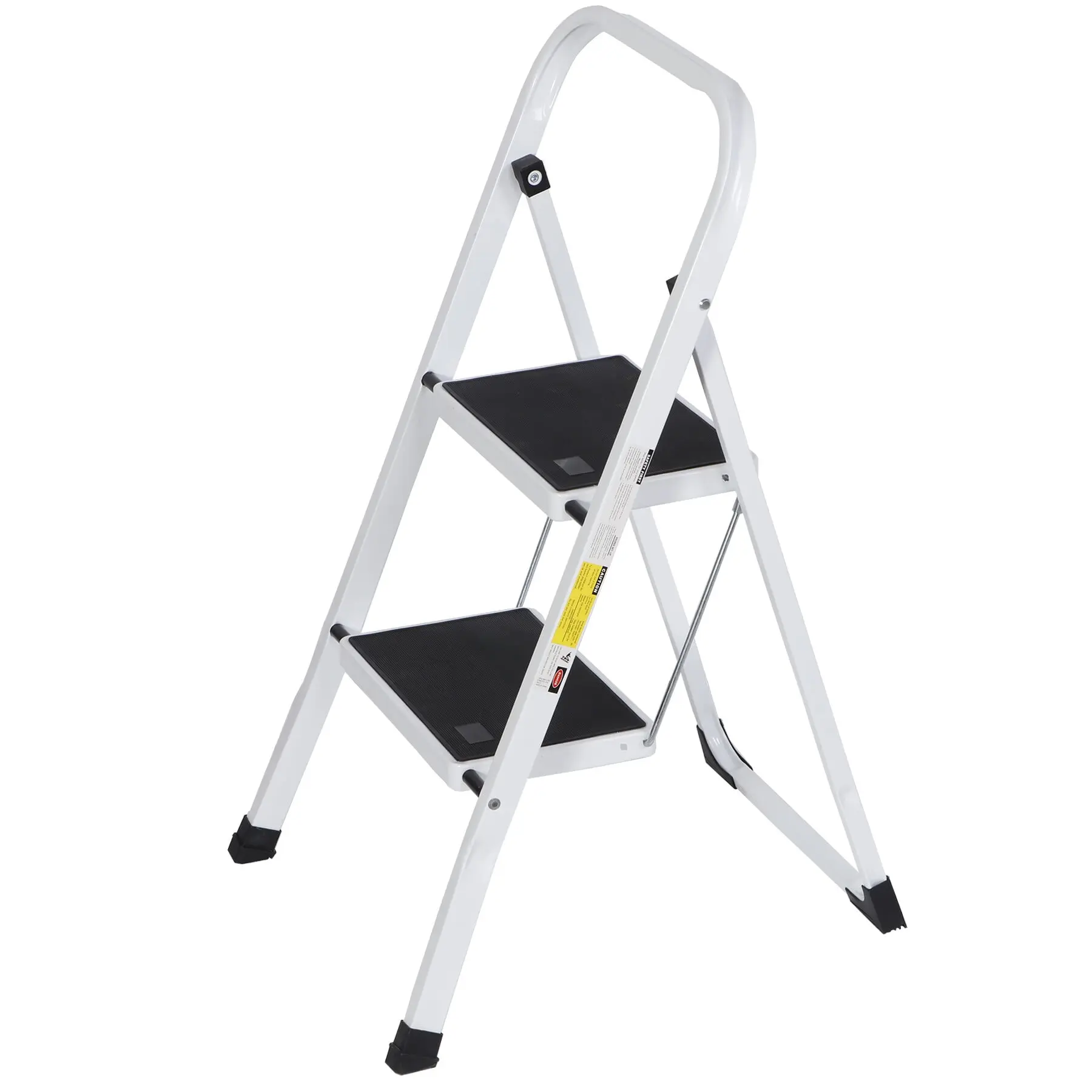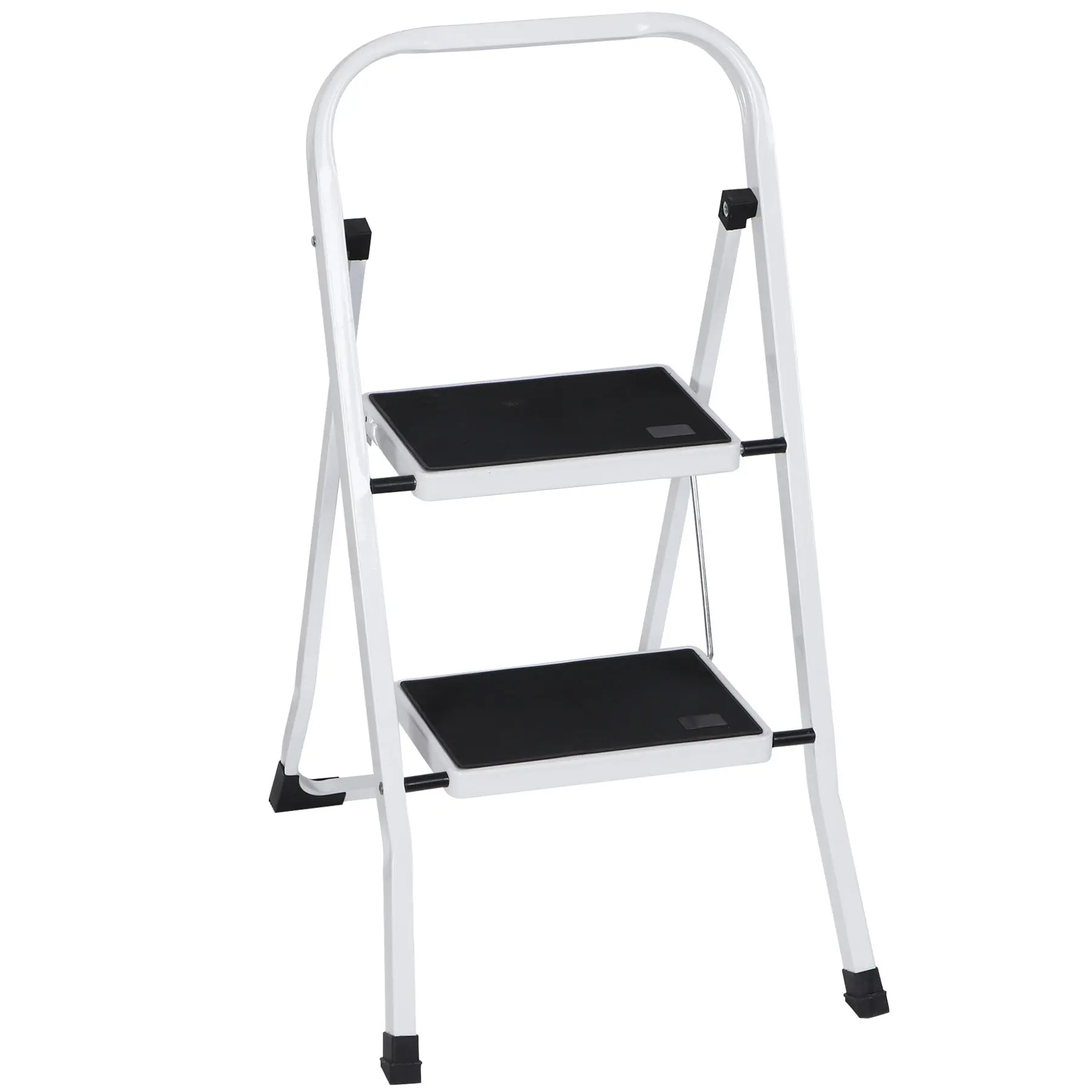 The 2-step ladder was made of heavy-duty steel, the frame distributes weight evenly for total stability. Ideal for reaching high cabinets or adding extra height for cleaning, and painting. Great for use in the kitchen, garage, and laundry room, while cleaning, or doing home repairs. That's a perfect tool.Overall Sizes: 18 x 21.9 x 31.8" Folding Sizes: 35.4 x 18 x 1.8" Materials: Metal Weight Capacity: 352lbs G.W.: 10 lbs Color: White, Black