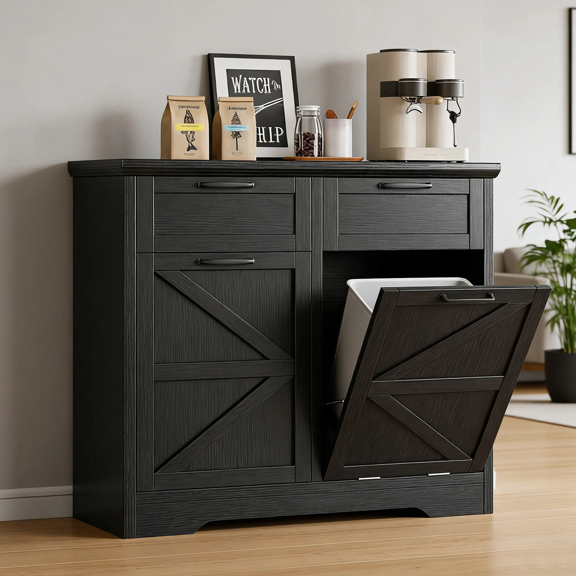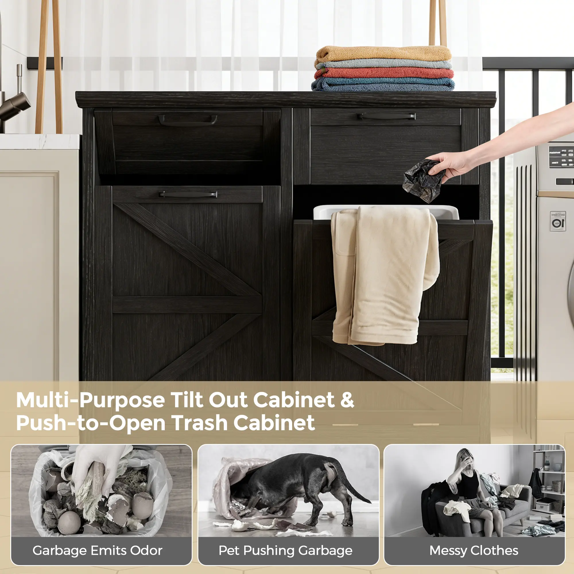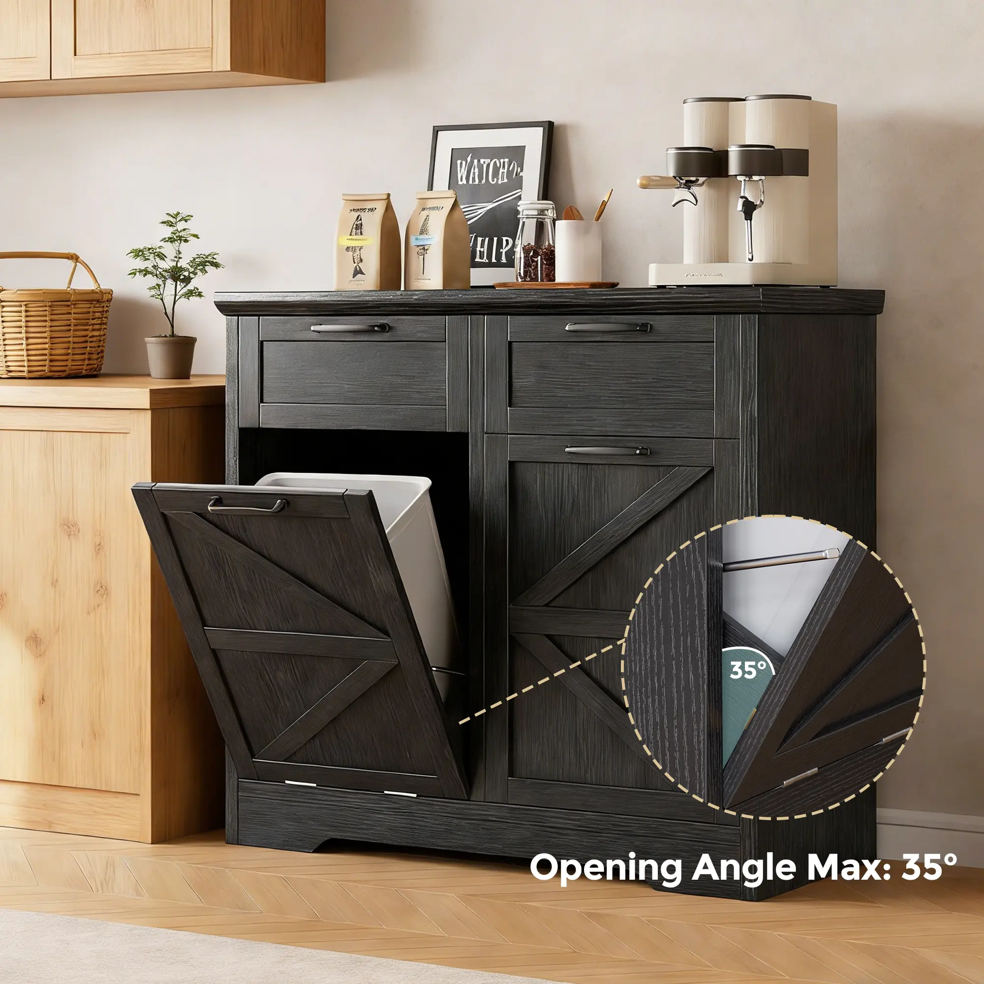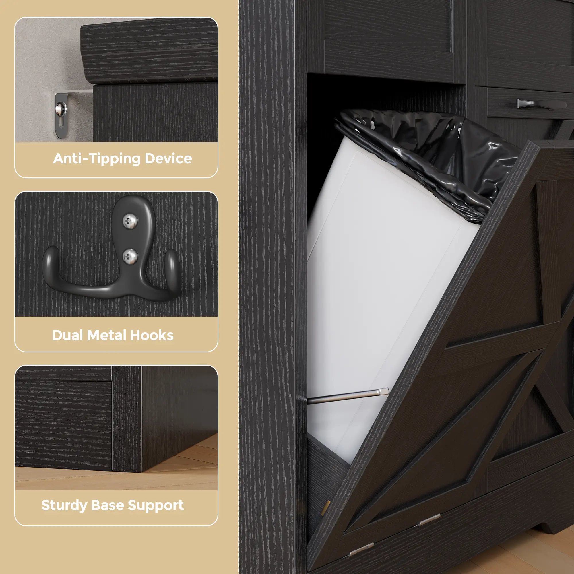 ·[Versatile Trash Cabinet] The left side features a pull-out drawer for daily essentials and a tilt-out trash bin cabinet for trash/pet food. The right side includes a push-to-open garbage cabinet with press panel for standing disposal, while behind the pull-door stores large kitchen items—a complete storage solution.