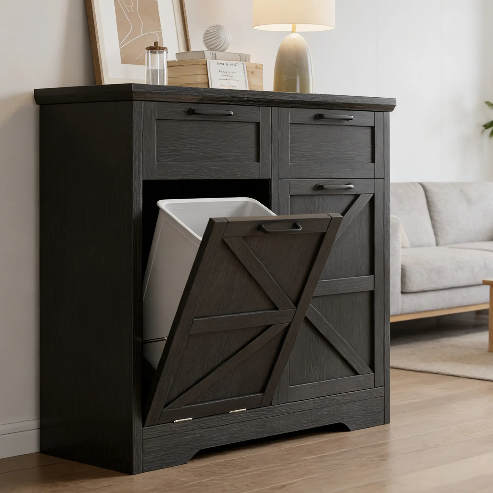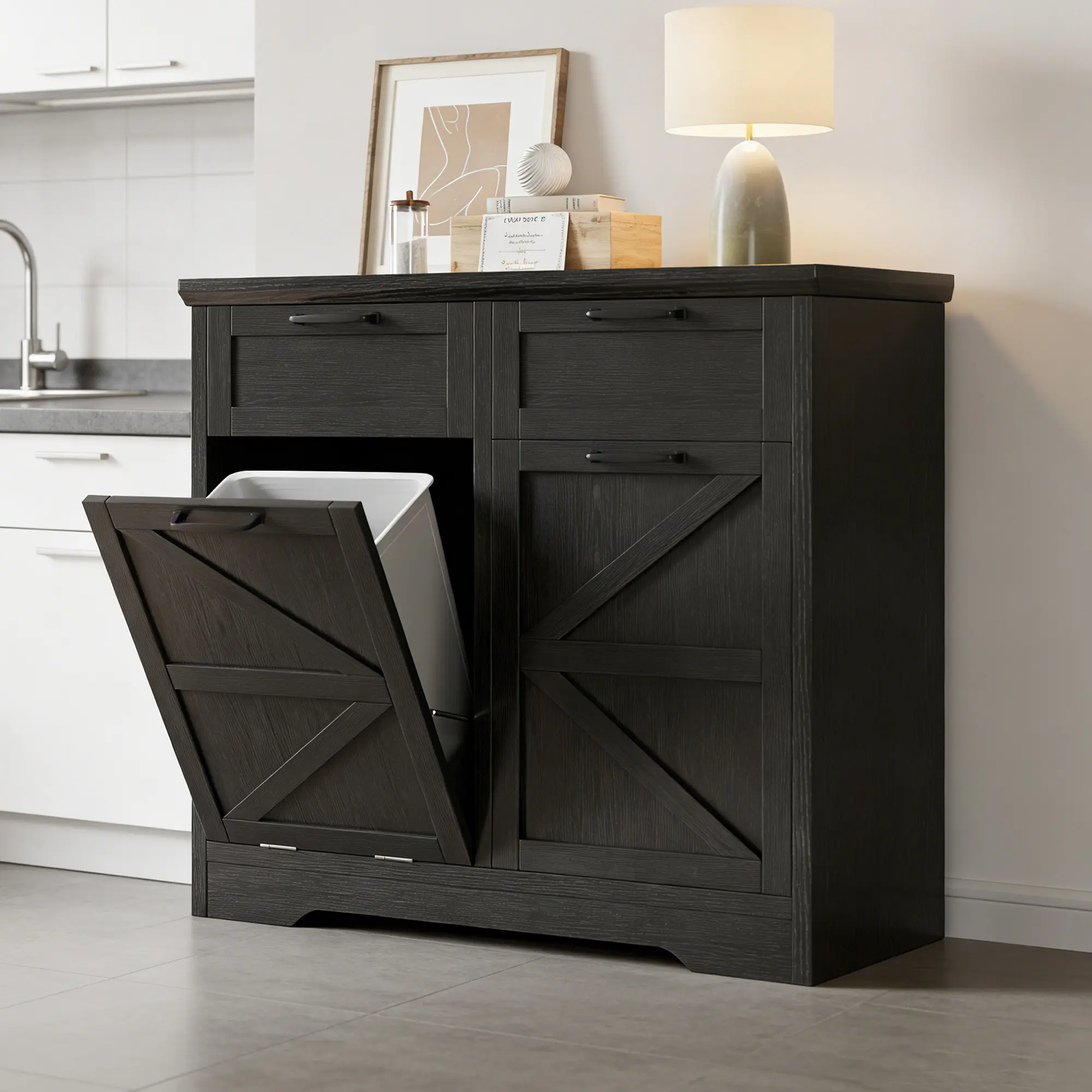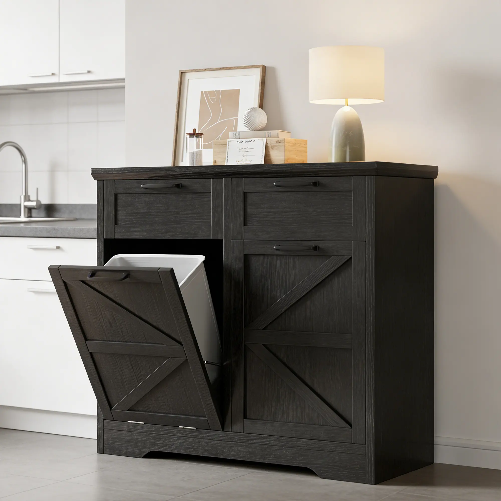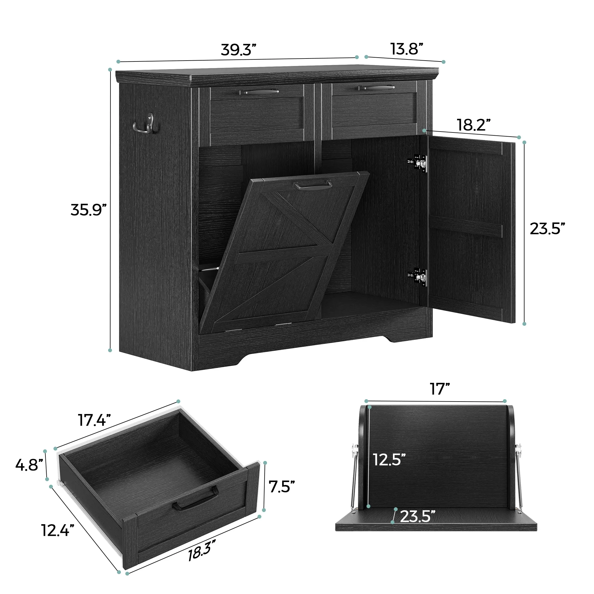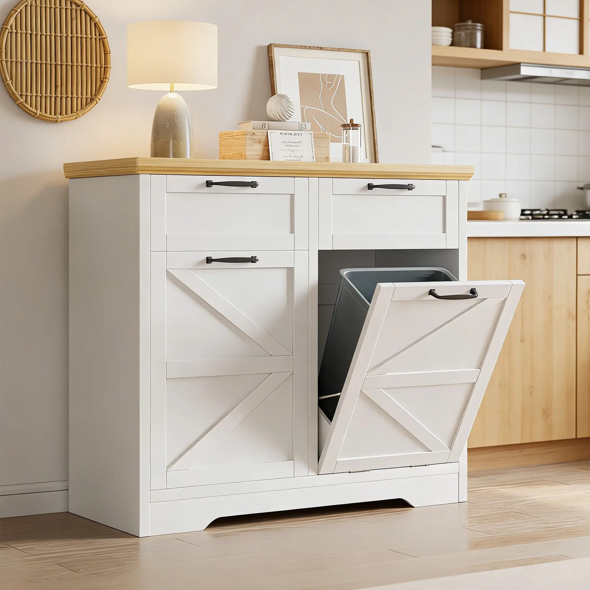 ·[Elegant Wooden Aesthetic] Featuring modern wood textures and unique door panels, this tilt-out trash cabinet enhances visual appeal and space feel. It pairs beautifully with both modern and farmhouse styles. More than just a garbage cabinet, it can serve as a kitchen island, laundry cabinet or even a coffee station. A ideal addition to your kitchen, dining room, living room or laundry room.