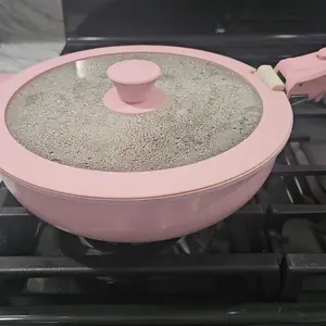 The product is not as described, it smells really bad, like chemicals, I don't know how to describe it, the food sticks, the material is of very poor quality, very bad. I handle the pans with care and still