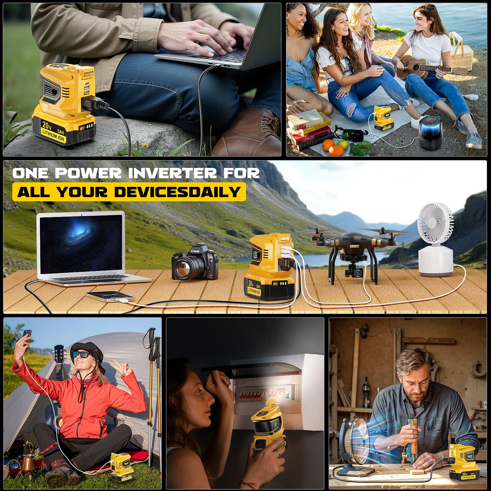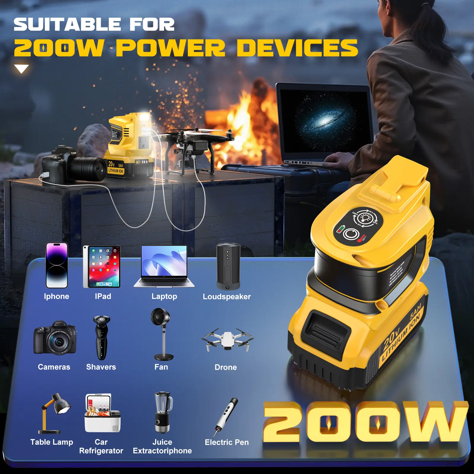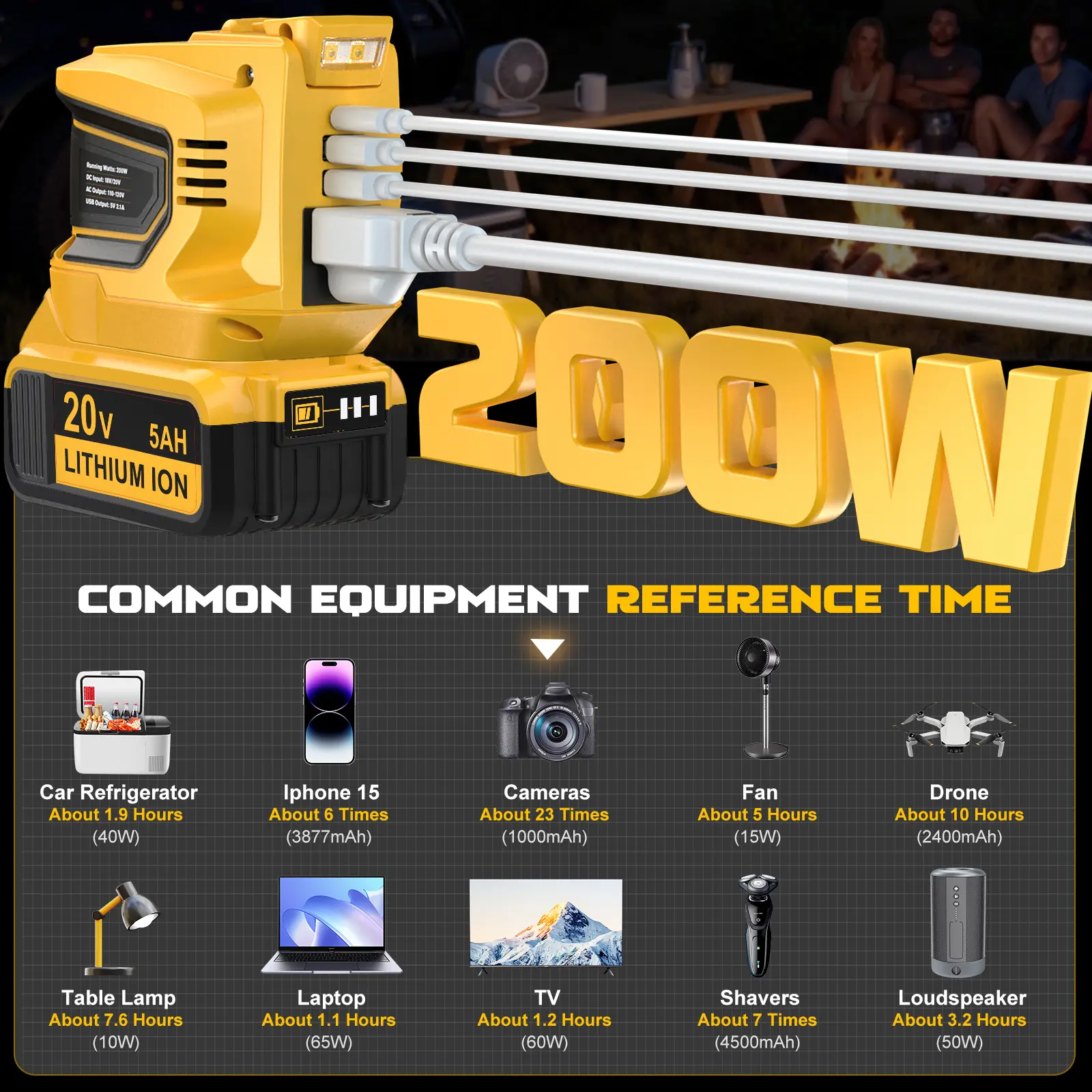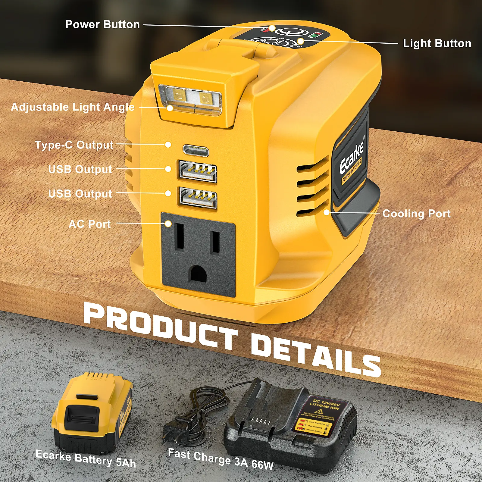Our power inverter comes with a 5Ah battery and a charging station. The portable power station is compatible not only with the included 5Ah battery but also with Dewalt 20V batteries. The included charging station can charge both the provided 5Ah battery and Dewalt batteries, offering excellent compatibility.