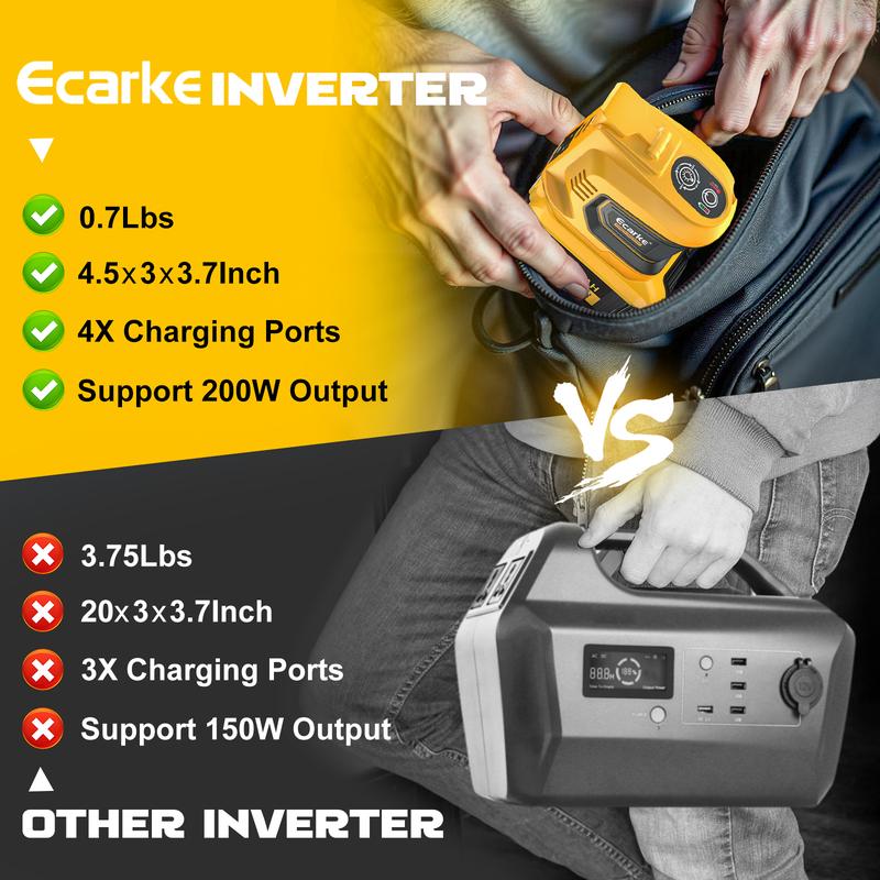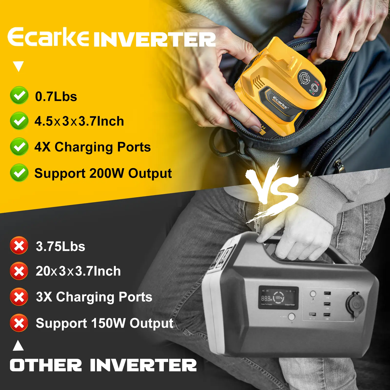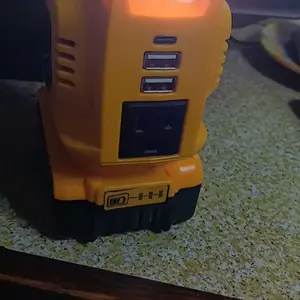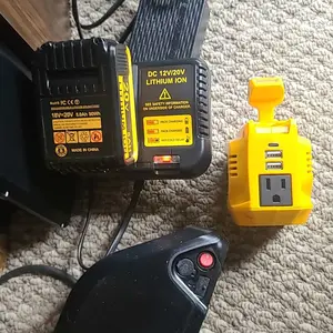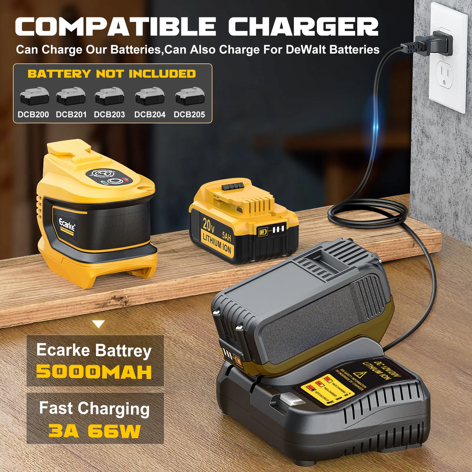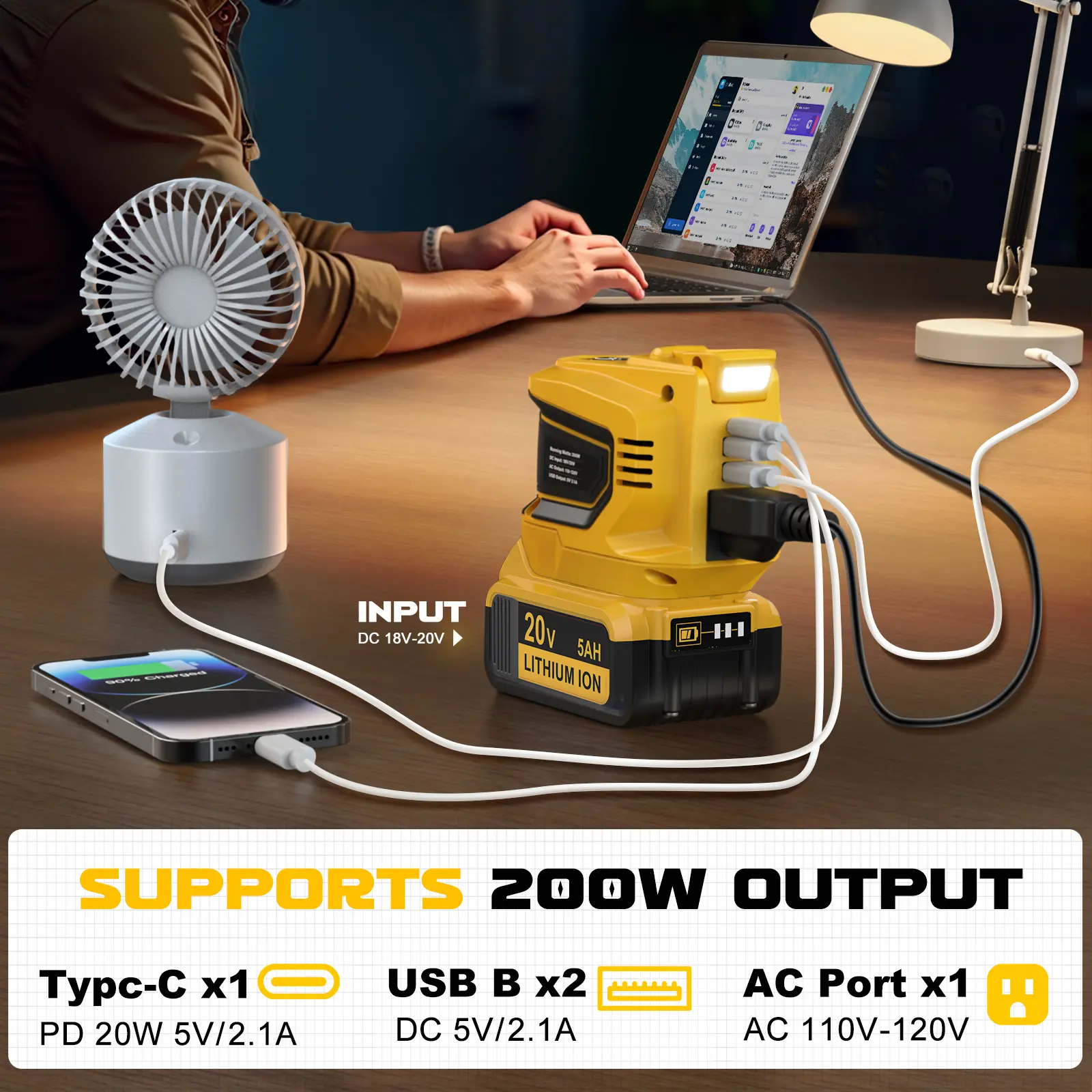 Our power inverter comes with a 5Ah battery and a charging station. The portable power station is compatible not only with the included 5Ah battery but also with Dewalt 20V batteries. The included charging station can charge both the provided 5Ah battery and Dewalt batteries, offering excellent compatibility.