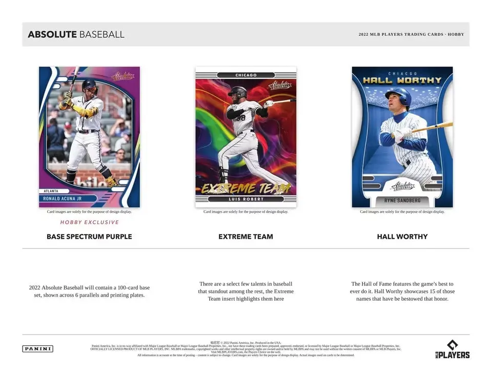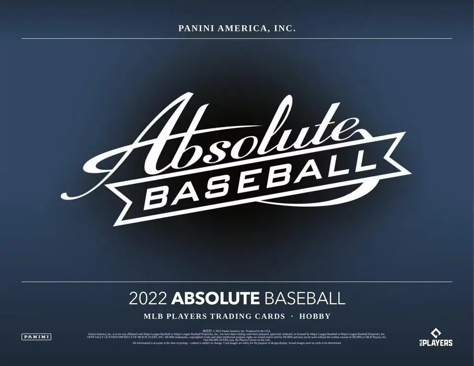 BASE:Â 2022 Absolute Baseball contains a 100-card base set, shown across six parallels and printing plates.