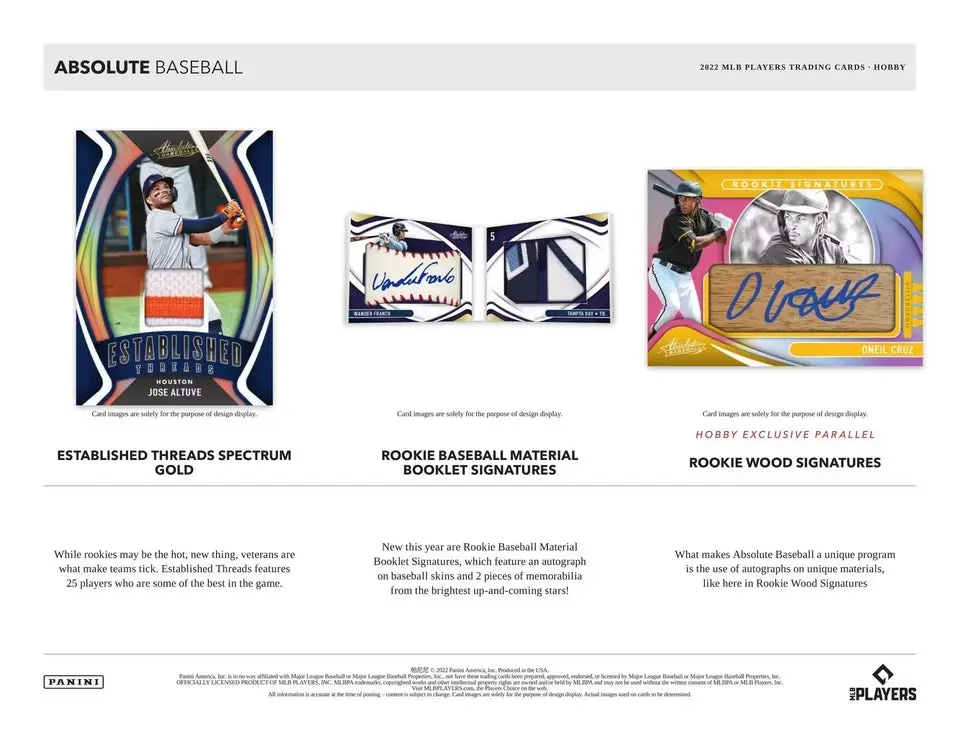 Absolute Baseball showcases autographs from a strong 2022 rookie class on multiple materials like wood in Rookie Wood Signatures and baseball skins in the NEW Rookie Baseball Material Booklet Signatures.