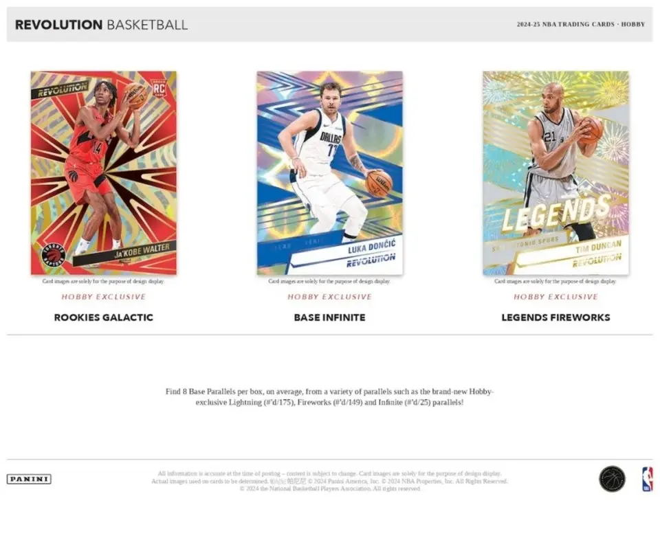 Find 8 Base Parallels per box, on average, from a variety of parallels such as the brand-new Hobby-exclusive Lightning and Infinite parallels!