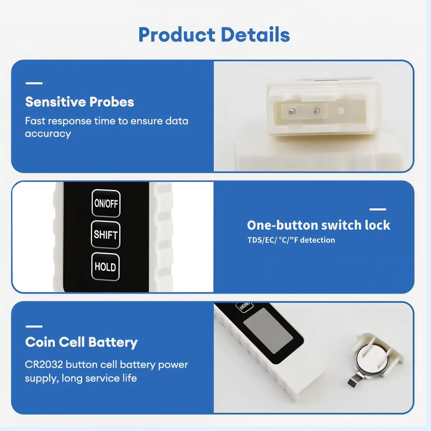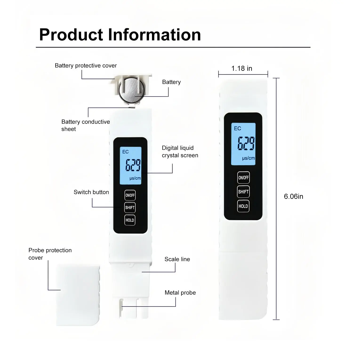 【PPM Value Range】A PPM value of 0-50 indicates ideal drinking water; a PPM value of 50-100 represents relatively ideal drinking water; a PPM value of 100-200 means acceptable drinking water; a PPM value of 300-400 indicates that scale will form; a PPM value of 400-500 means the water has an unpleasant taste; when the PPM value exceeds 500, the water is polluted and unfit for drinking. ·【Easy-to-Read LCD Display】With a large backlit screen, readings can be clearly viewed even in low-light conditions. The automatic locking function saves readings for convenient use, making it an excellent TDS water tester. ·【Reliable Accuracy】Our digital water quality tester combines a high-performance smart chip with a sturdy titanium probe to deliver fast and consistent results. It is perfect for use in swimming pools, aquariums, and with tap water. ·【4-in-1 Water Quality Tester】Can switch between TDS, EC, and °F/°C. Get instant and accurate readings for tap water, swimming pools, or hydroponics anytime, anywhere. ·【Durable and Reliable Design】The water tester features a tough ABS casing and a comfortable non-slip handle for easy operation. The advanced dual-core processor inside ensures fast and ultra-precise readings every time. ·【Instant Results】Ultra-fast 1-second reading.