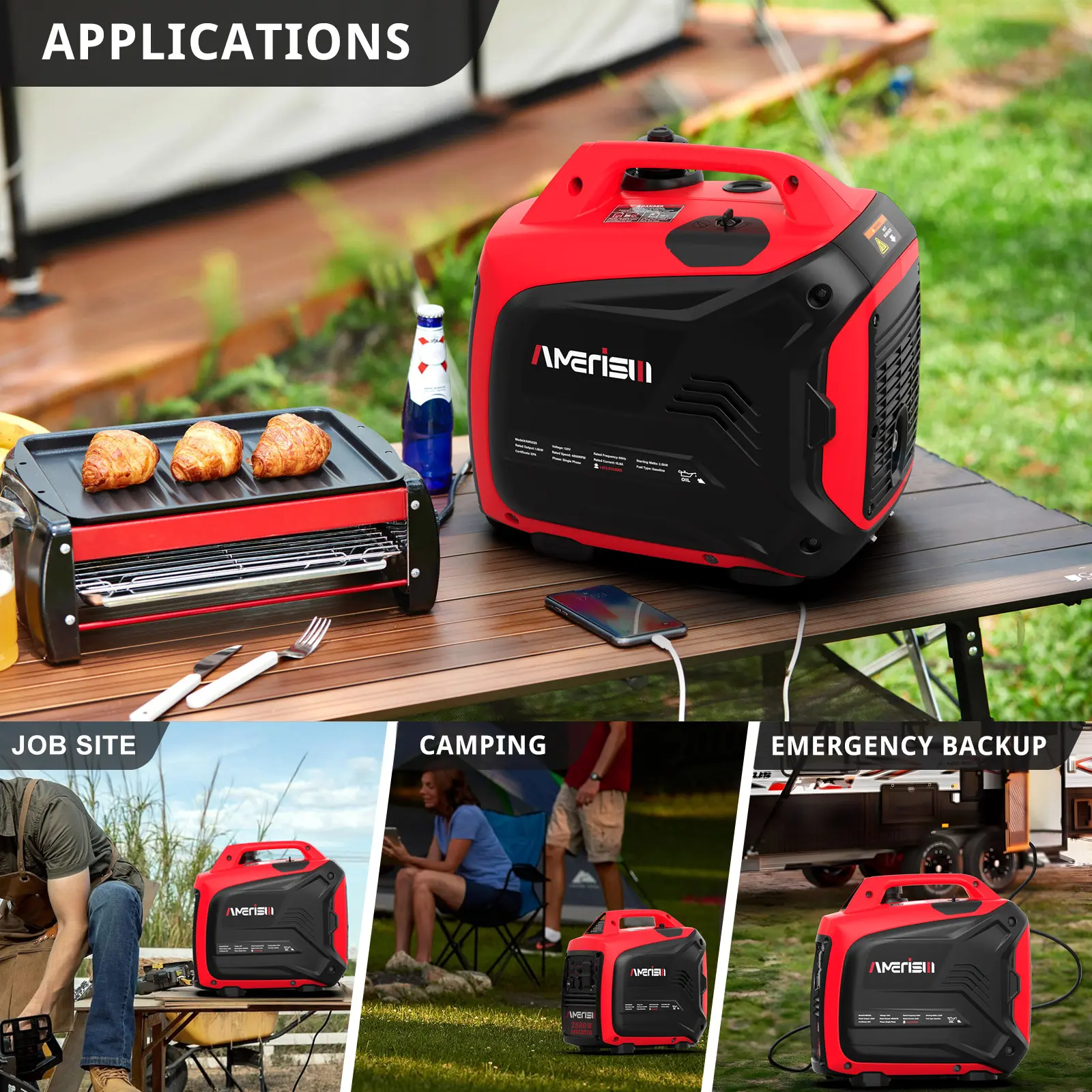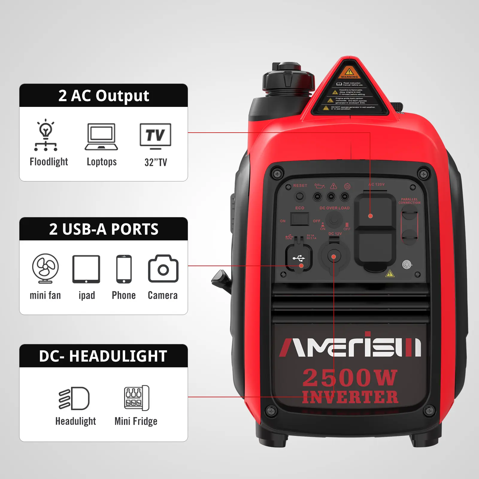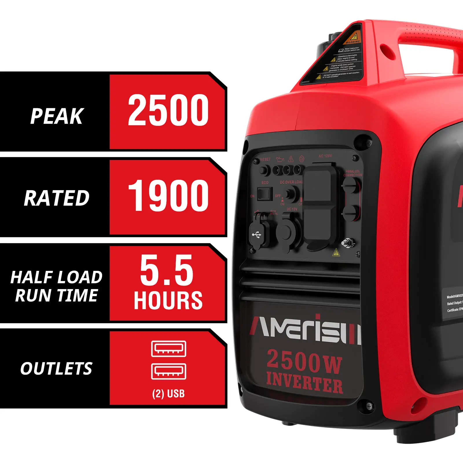 ·Powerful Wattage- With inverter technology, it produces 2,500 peak watts and 1,900 running watts of clean power (less than 3% THD). Make it perfect for tailgating, camping and emergency home backup.