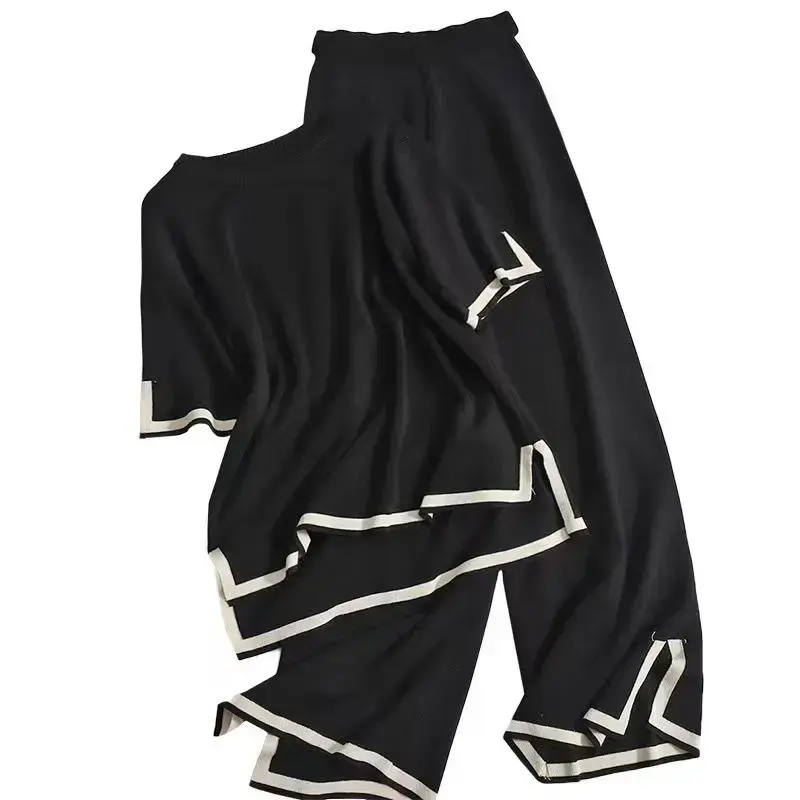 2025 New Fashion Set Elegant Color-Block Split Short-Sleeve Knit Top + High-Waisted Slimming Wide-Leg Pants Two-Piece Set Shirt Clothes