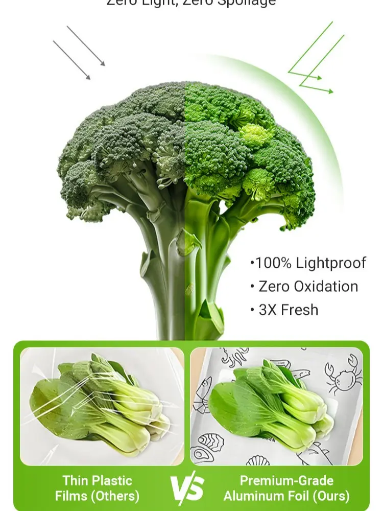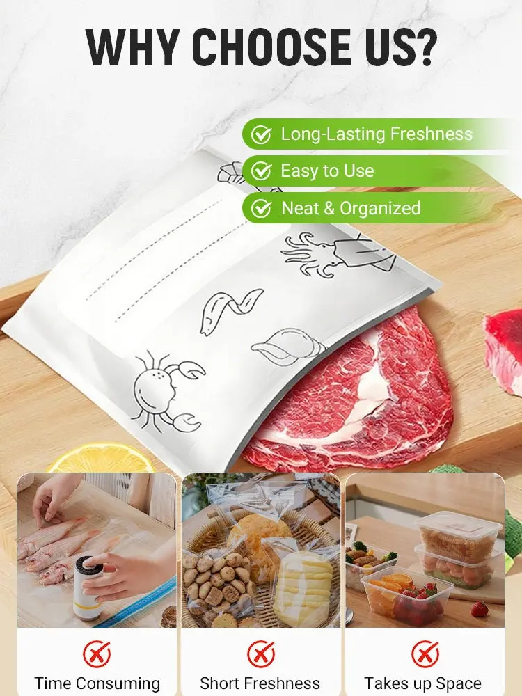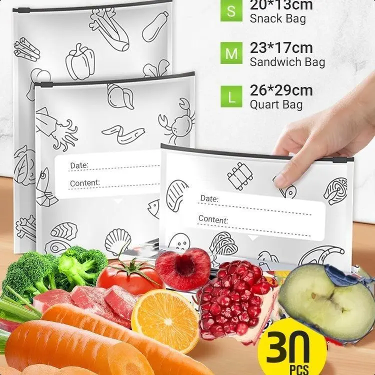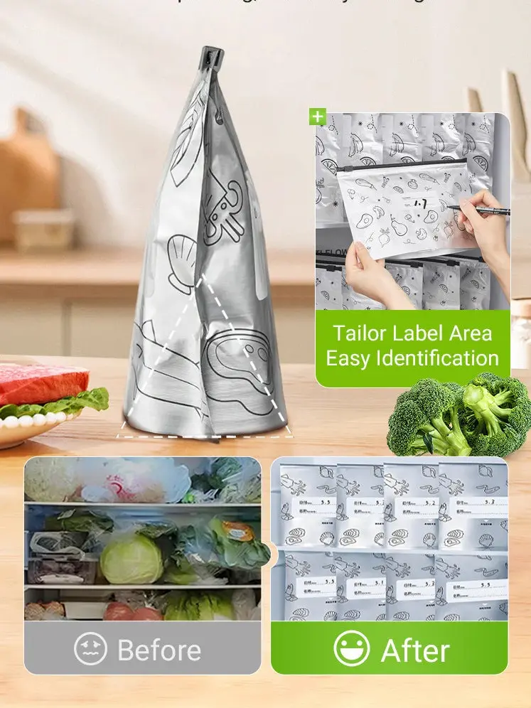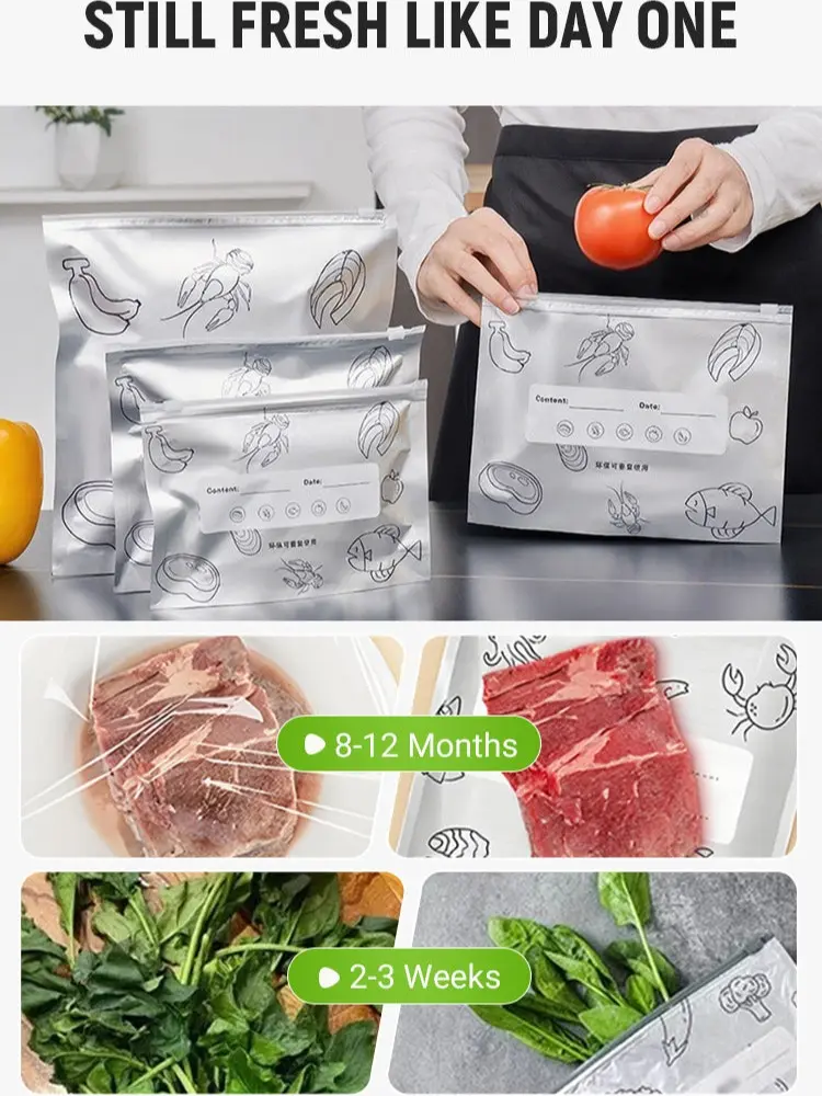 ✨ (30PCS, 3 Size) 2025 New Resealable Vacuum Zipper Pouches for food storage. These stand-up foil sealable bags come with labels and zip locks. Perfect for vegetables, fruits, and meats. Keep your food fresh longer with these versatile pouches.
