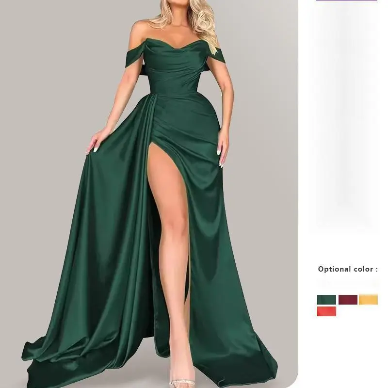 Product Description:/Off-shoulder design highlights collarbone elegance/Dramatic high slit adds bold red-carpet drama/Slimming cut creates hourglass figure enhancement/Luxury satin fabric perfect for galas and receptions/Breathable lining ensures comfort for all-night wear/Key Features :/2025 Western Women Off-Shoulder High Slit Sexy Slimming Banquet Party Evening Gown Dress/Off-shoulder neckline/Confidence-boosting high slit/Figure-sculpting silhouette/Formal banquet-ready design/Breathable evening fabric/The above content is the product introduction. you a happy shopping!