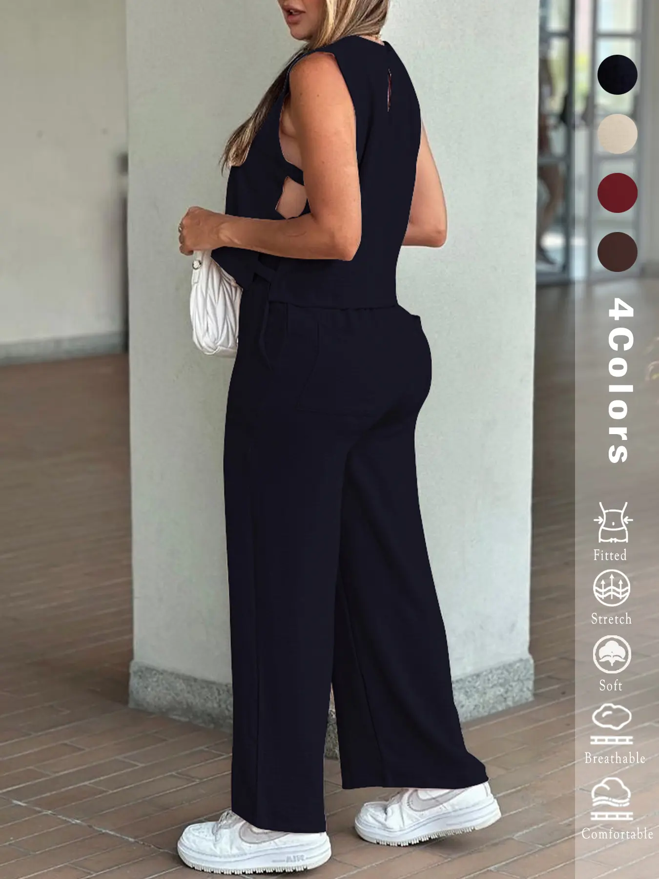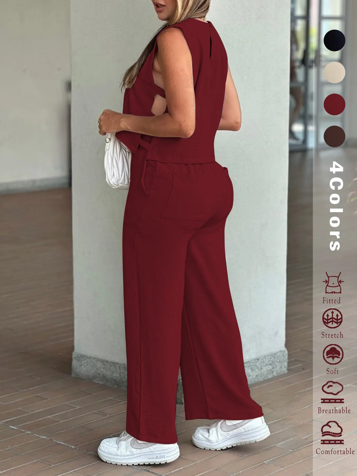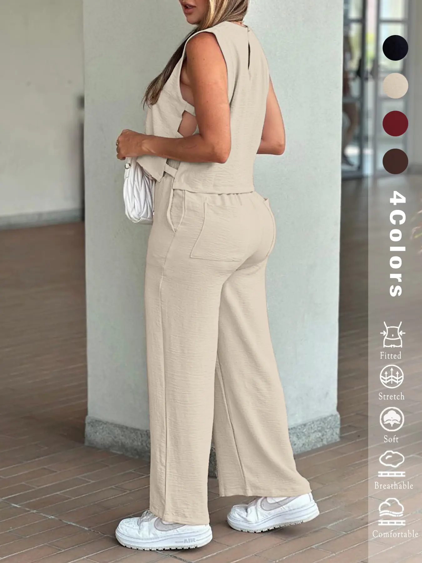 Women's 2PCS Set - Sleeveless Side Cutout Top & Wide-Leg Pants | Loose Fit, Elastic Waist w/Pockets | OOTD for Spring/Summer/Autumn | Office, Commute & Daily | All Body Types | #Fashion2025 #WorkWardrobe #LoungeElegance#casualoutfits #fashioninspo