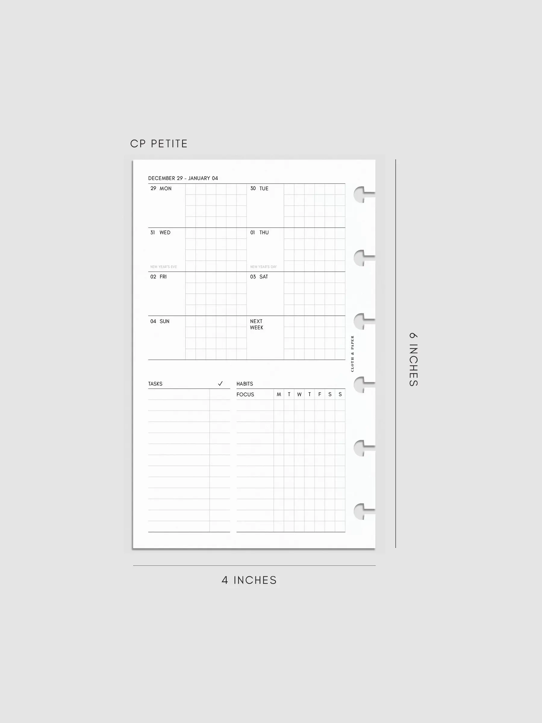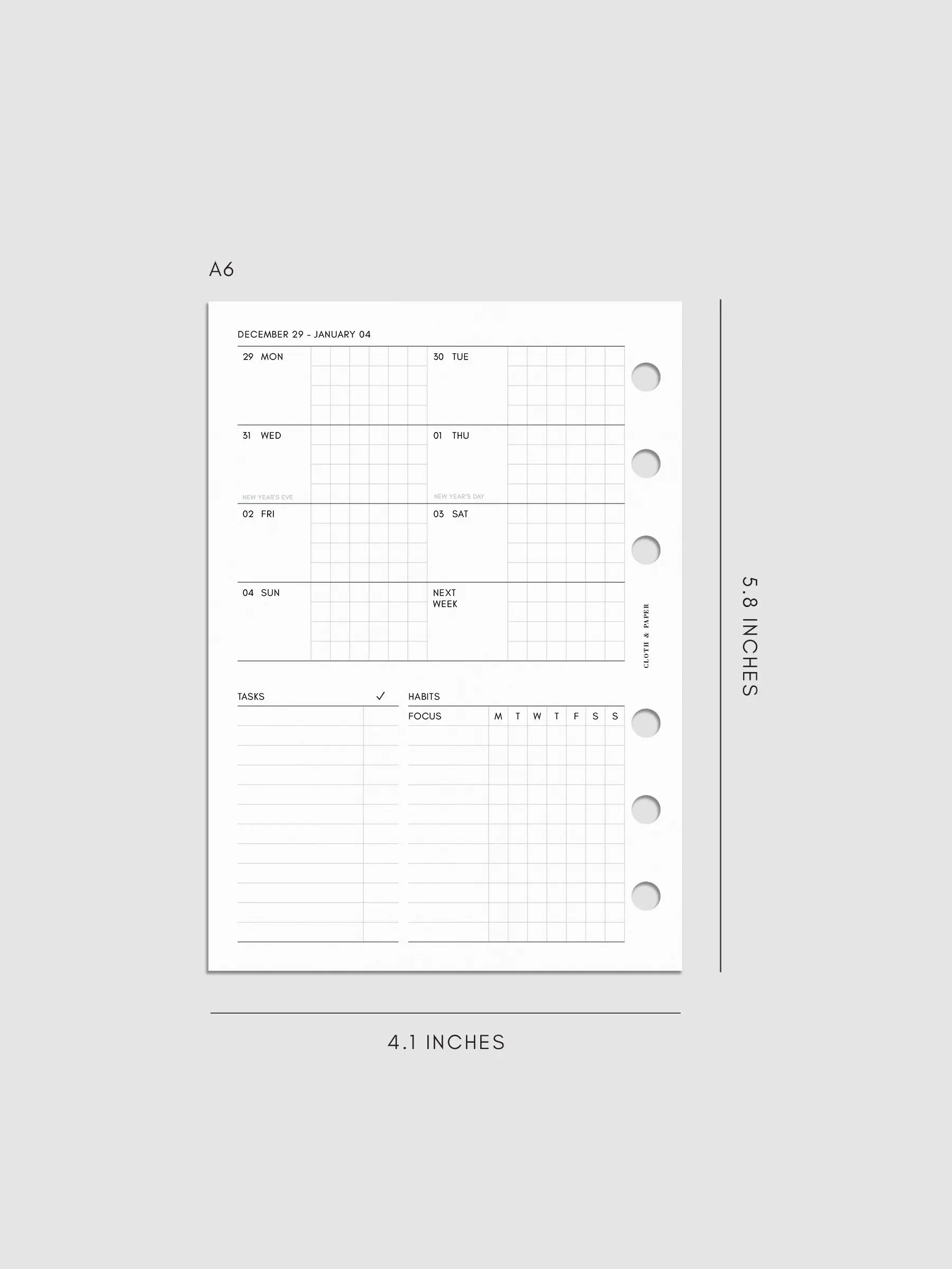 ·Weekly layout: week-of header, date, day of week, daily blank and graph sections, lined task list and weekly habits checklist
