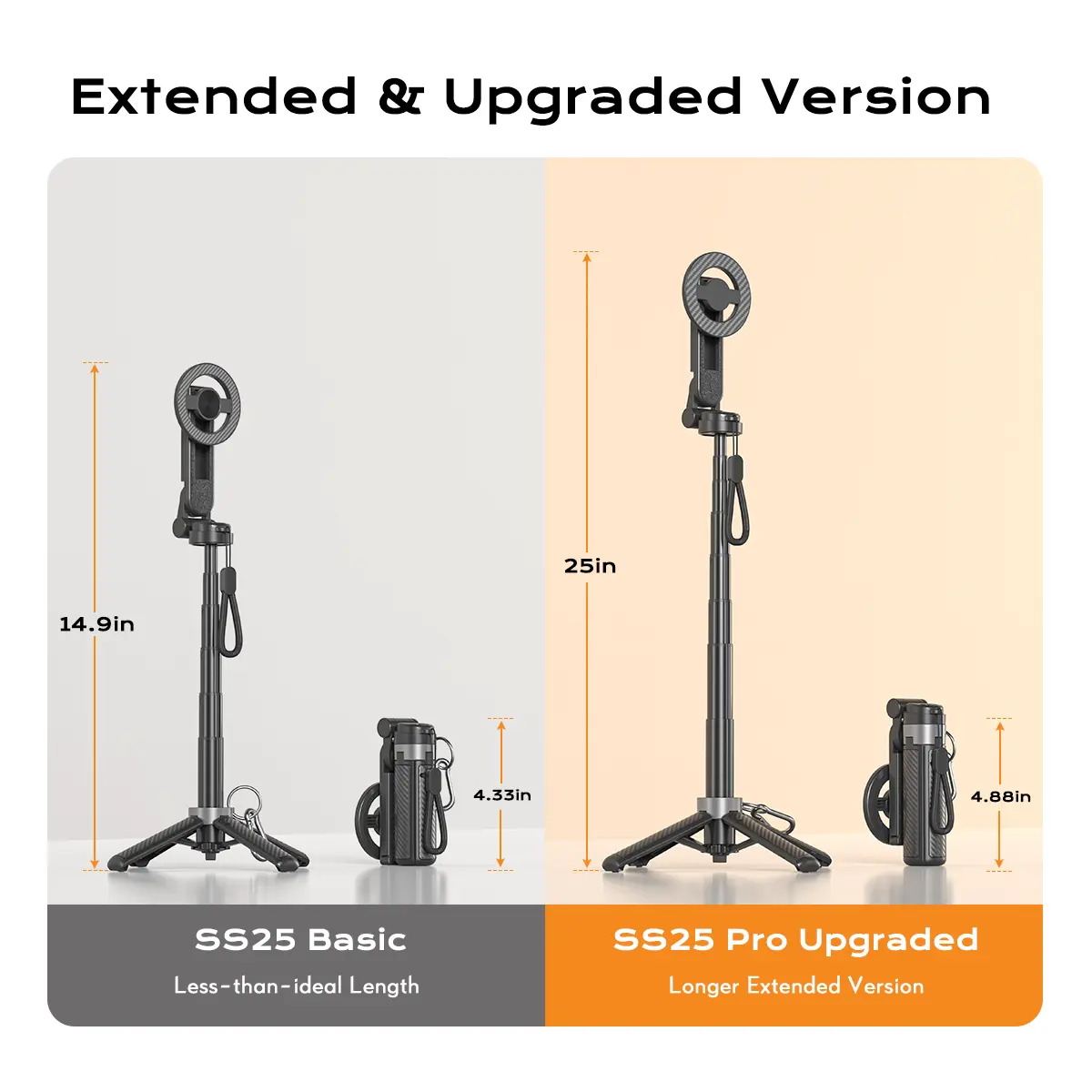 Upgraded from 15 to 25 inches, this selfie stick delivers a wider shooting angle and broader view—ideal for group photos, landscapes and vlogging. It meets all your shooting needs for selfies and video recording.