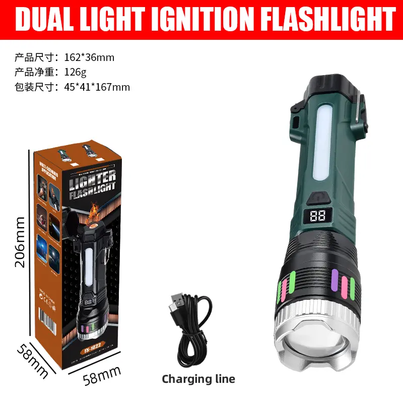 1. This flashlight has a built-in electric ignition at the base—perfect for camping or emergencies. Just press and ignite.