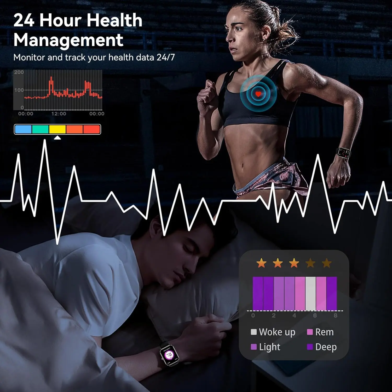 Health Tracking: Android smart watch has a built-in optical sensor that continuously monitors your stress, heart rate, and sleep quality. The sleep tracker provides a comprehensive quality analysis of your sleep to help you make informed decisions.