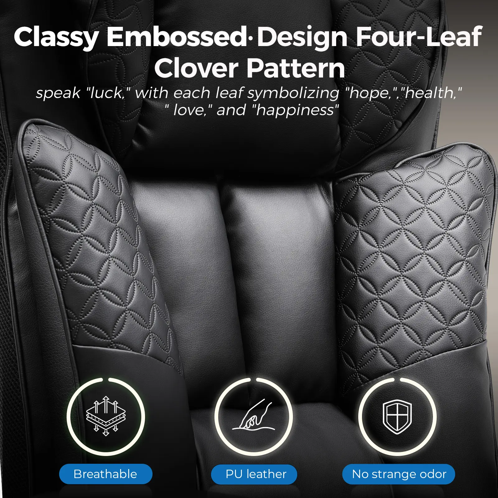·Luxurious PU leather: This ergonomic gaming chair features an elegant embossed four-leaf clover pattern and durable, scratch-resistant bonded PU leather, perfectly complementing your home office or room decor. Ideal for your home desk.