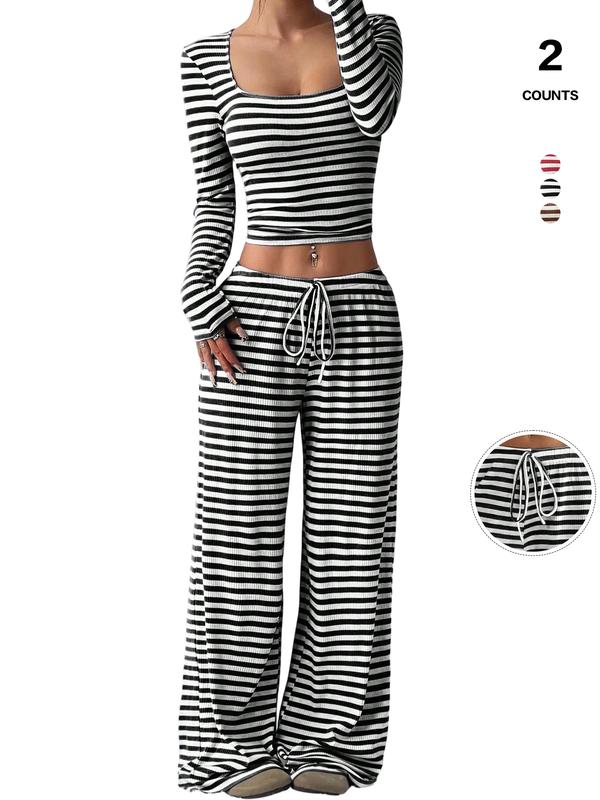 Women's 2-Piece Y2K Style Striped Ribbed Knit Long Sleeve Square Neck Crop Top & High-Waist Drawstring Wide-Leg Lounge Wear Set #womenspajamas #plussizesweatsuit #flatteringtwopieceset #womens2piecesets #longsleevejumpsuit #comfy2piecesets #loungewearsets #twopieceskirtset #usloungewearlooks #flatteringloungewear
