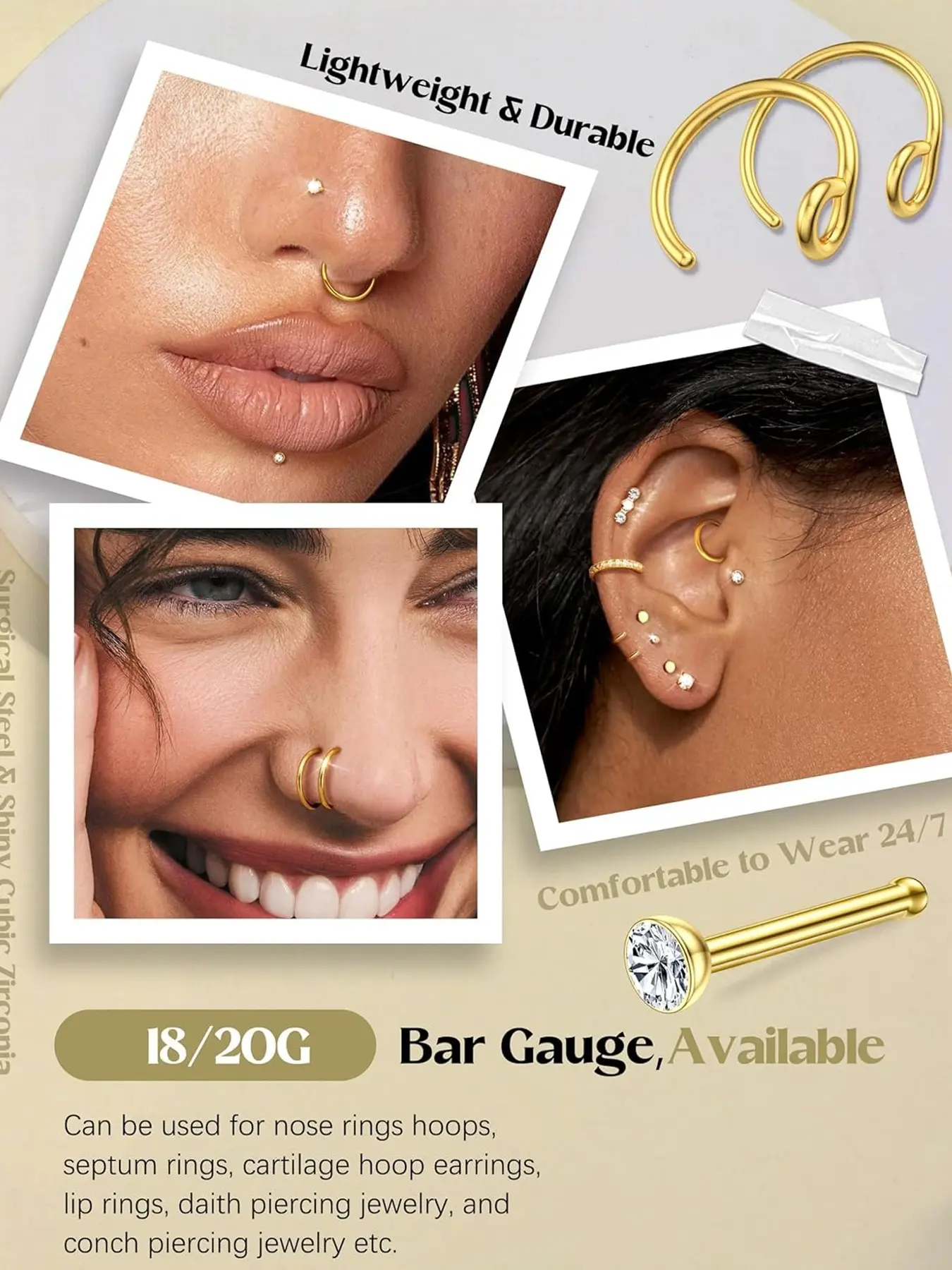 【L-Shaped Piercing】: Designed with an L-shape for easy insertion and secure placement, minimizing the chance of dislodgment.