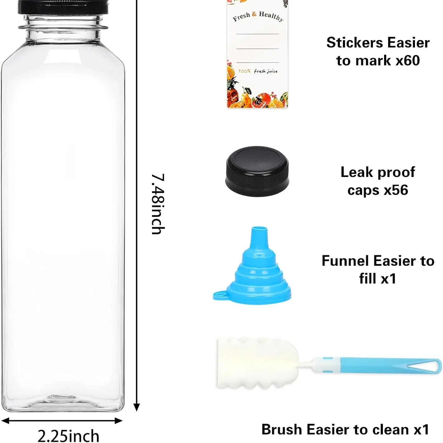 ·SUPER-VALUE PACK: Package contains 20pcs 16oz plastic juice bottles with caps.It comes with cleaning brush, funnel and 24pcs stickers.You can use labels to mark and differentiate each drink, the brush and funnel are for your daily use and cleaning.